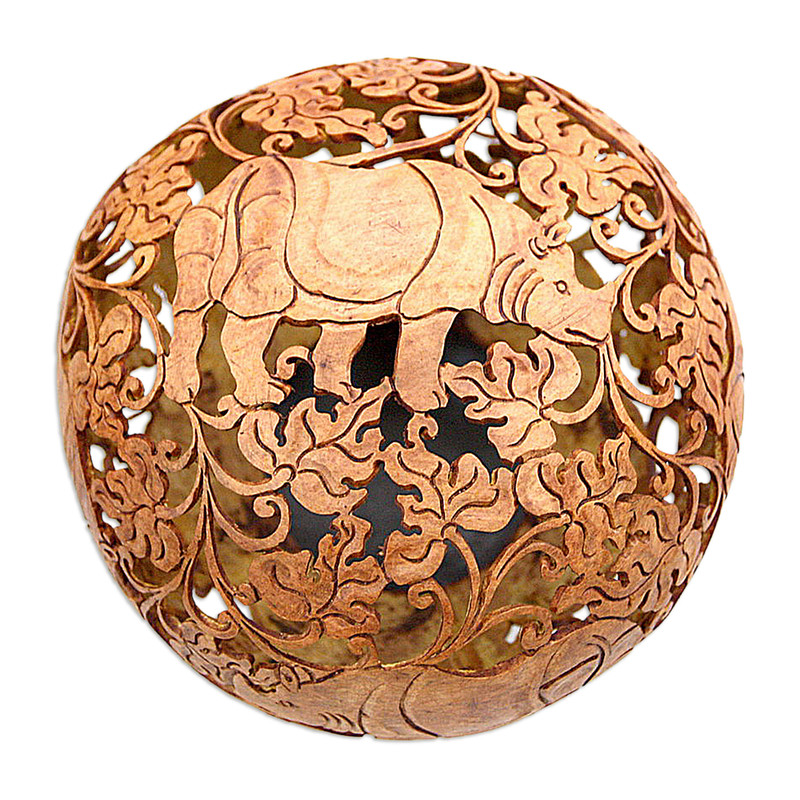 Rhinos explore the wonders of a summer garden in a detailed sculpture from Eka. Designed in memory of her late husband, the globe is carved by hand from coconut shell with exquisite detail. It includes an albesia wood stand.