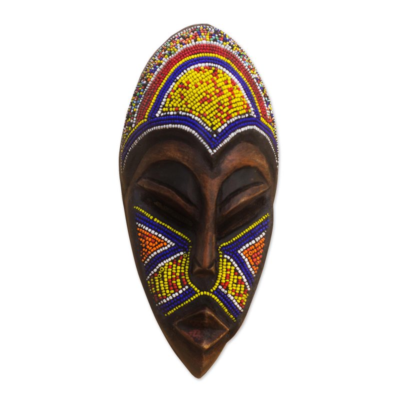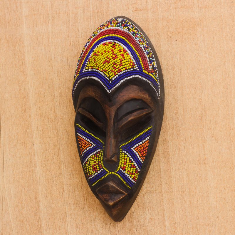 Modest in size, this original mask design nonetheless makes a big impact. Awudu Saaed of Ghana crafts the mask, carving it by hand from rubberwood and embellishing it with colorful recycled glass beads. The artisan names his creation Domeabra, which translates to "come to me if you love me" from the Akan language.