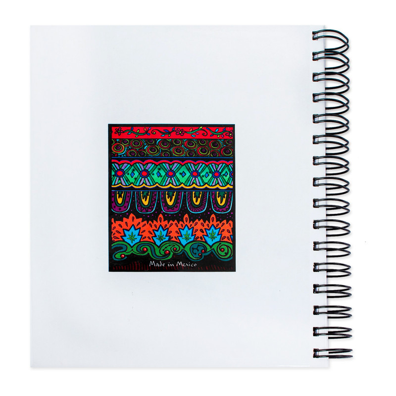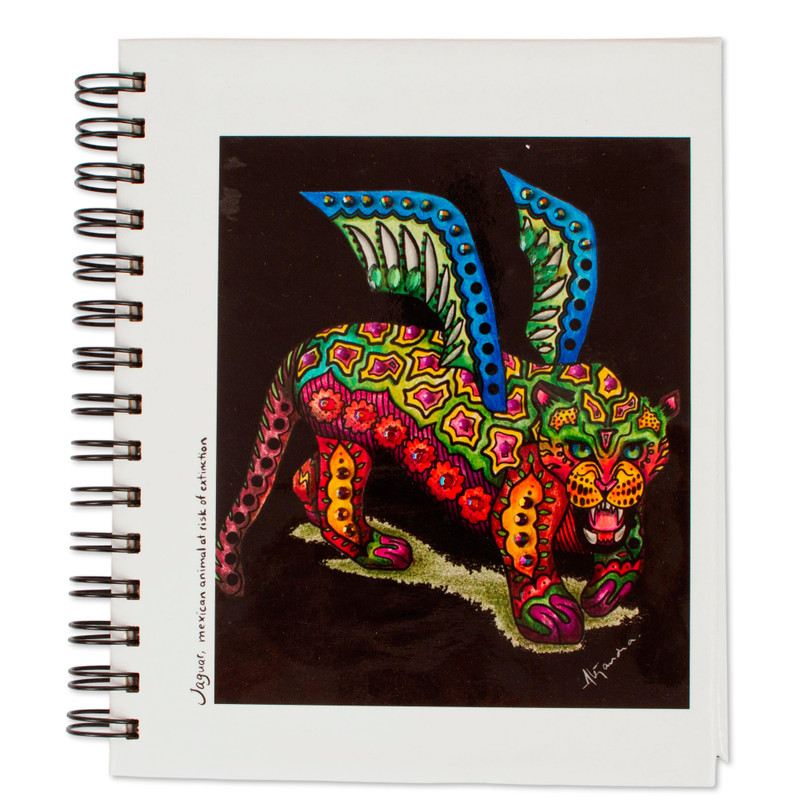 Rendered in the style of traditional alebrije folk art sculptures, the cover of this journal depicts a colorful jaguar with wings. On one side is the note, "Jaguar, Mexican animal at risk of extinction". The signed artwork, from Alejandra Aceves' "Everyday Stories" collection, graces a spiral-bound notebook of lined paper.