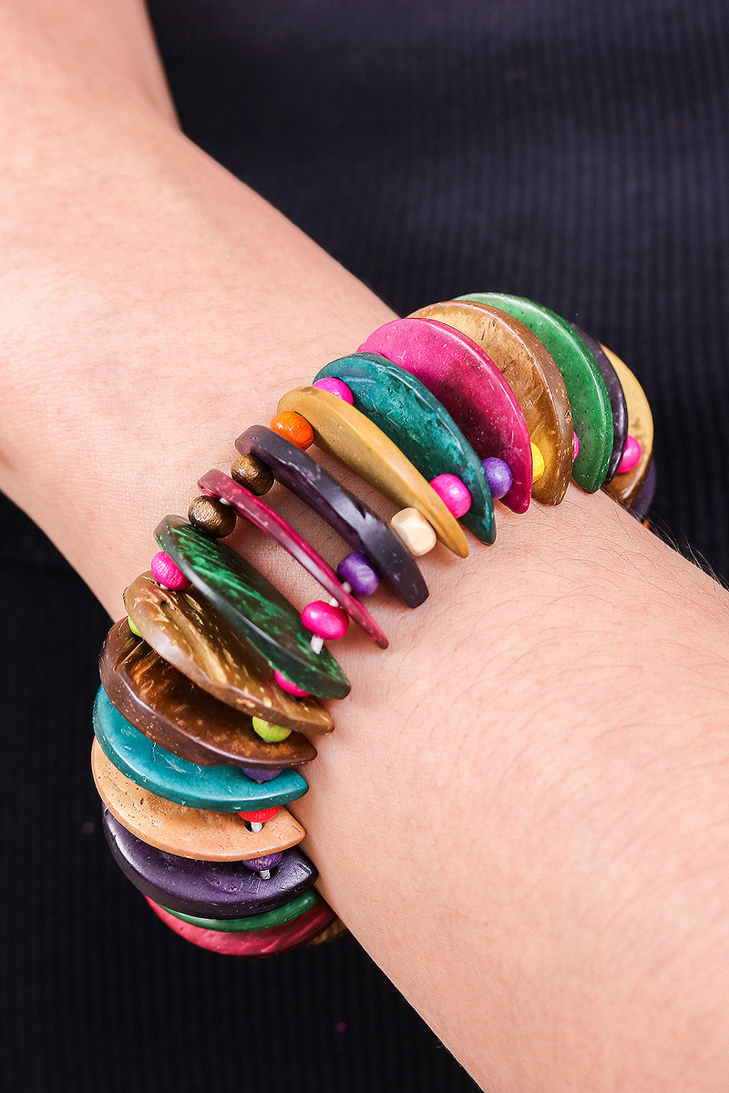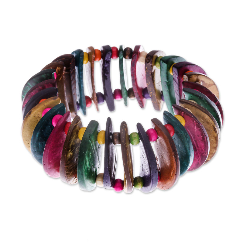 Semicircular coconut shell pieces and petite littleleaf boxwood beads carefully dyed in an array of vibrant colors are interspersed perfectly to create a design that commands attention. Thai artisan Sumalee Nawakul's gorgeous stretch bracelet makes a fashion statement, elevating any look whenever you wear it.