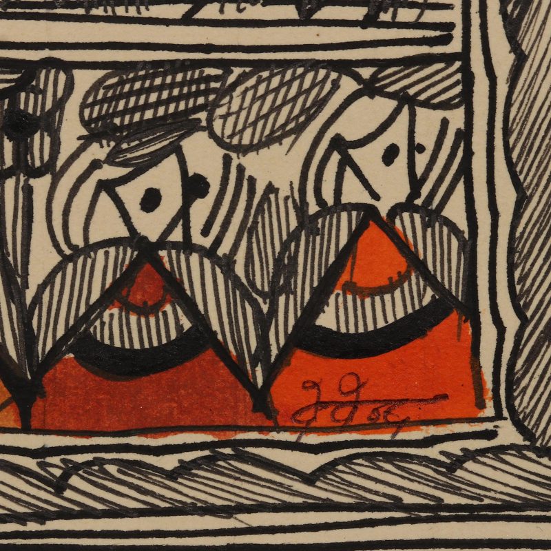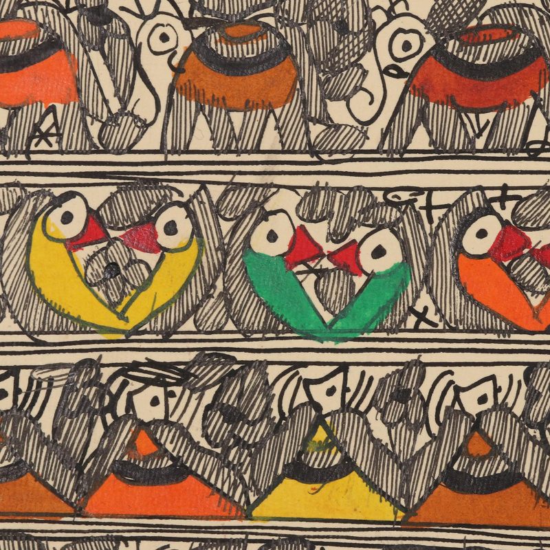 Devendra Kumar Jha works with natural vegetable dyes on handmade paper to create this stunning Madhubani painting. Madhubani, a traditional style of Indian painting, features eye-catching geometric shapes created with fingers, twigs, brushes, nib-pens, and matchsticks. This painting depicts rows of cheerful birds, colorful elephants, and villagers holding hands.