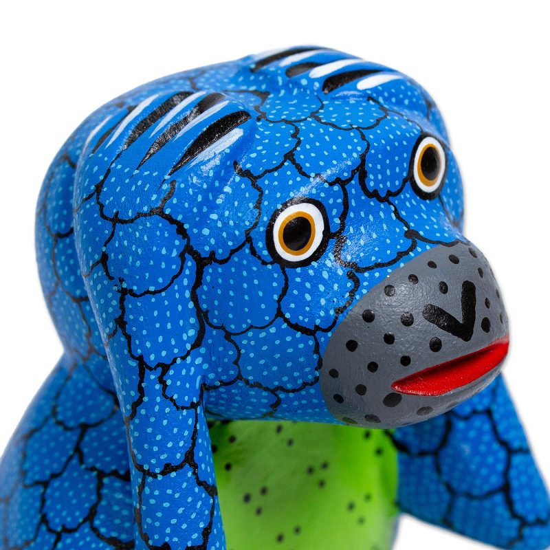 This colorful little monkey cannot believes his eyes! This sculpture is an example of a Oaxacan alebrije, a copal wood carving, hand-painted in bright colors and intricate patterns. This image is the work of Jesus and Roxana Hernandez noted alebrije carvers whose work has won awards and media attention. The tail is removed for shipping.