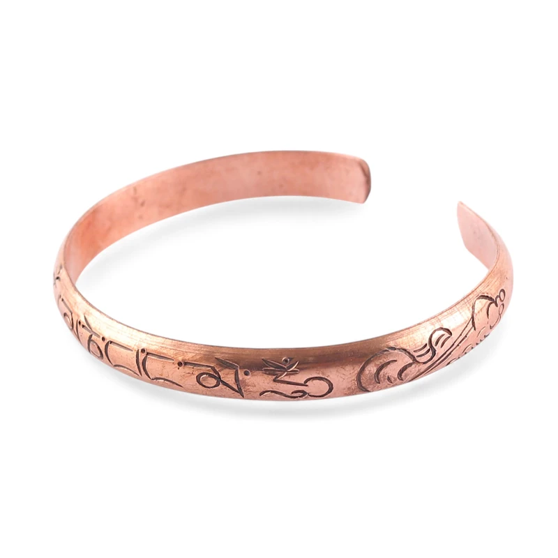 Immerse yourself in the timeless elegance of tradition with this copper cuff from India's Sumit Dhawan. It features an intricately engraved inscription in an artistic Devanagari-inspired script, giving it both cultural significance and visual intrigue. Echoing the ancient belief in copper's healing properties, this cuff is perfect for those who love meaningful design that transcends mere jewelry.