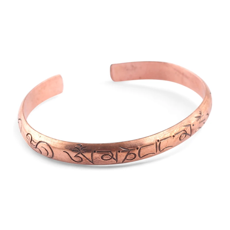 The inscription on the bracelet reads: 'Om Mani Padme Hum'. The English translation is: 'The jewel is in the lotus.' It symbolizes the path to enlightenment and the union of compassion and wisdom. This mantra is often worn for protection, spiritual focus, and as a reminder of inner peace.