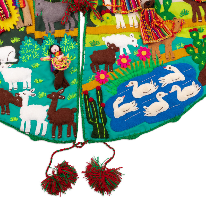 Backed by our 100% Happiness GuaranteeArpillería or patchwork is a traditional handicraft technique very popular in Peru that artisan Leonor Quispe uses to craft by hand this splendid Christmas tree skirt from a cotton blend. The skirt features colorful Andean motifs with Mary, Joseph and baby Jesus greeted by the Three Wise Men as well as holiday icons like Santa and his reindeer. All figures are crafted separately in three dimensions, embroidered and meticulously attached to the background fabric which is topped by tassels in red and green.