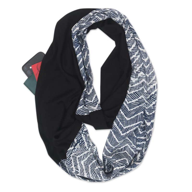 Stash your valuables somewhere safe and secure when you're on the go. Designed with a zippered pocket, Agus Suryanto's batik infinity scarf will let you do just that. The Javanese artisan hand-stamps the rayon and cotton blend scarf with a lively zigzag pattern you'll want to show off.