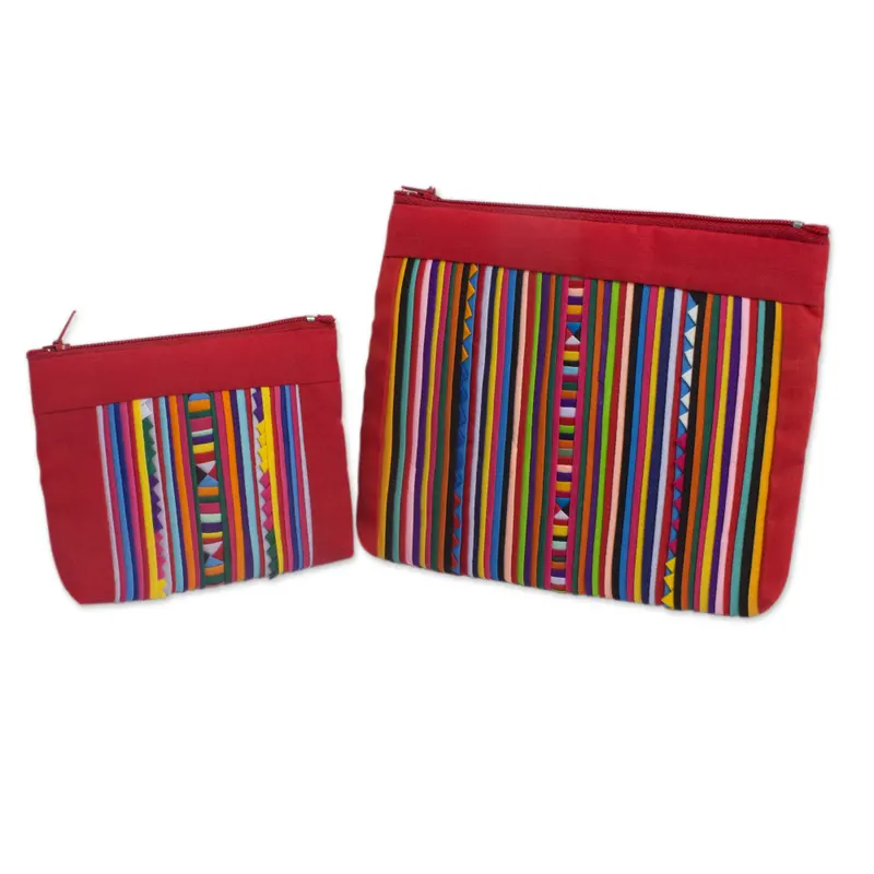 Thai Tribal Crafts presents a pair of versatile cosmetic bags highlighting the unique appliqué work of the Lisu hill tribe. Featuring red borders, the appliqué composition is sewn in shades of red, yellow,pink, green, purple, blue, dark blue, orange, cream, black and white. Both pouches are lined in black and close with a zipper. Only the big bag has an inner pocket.