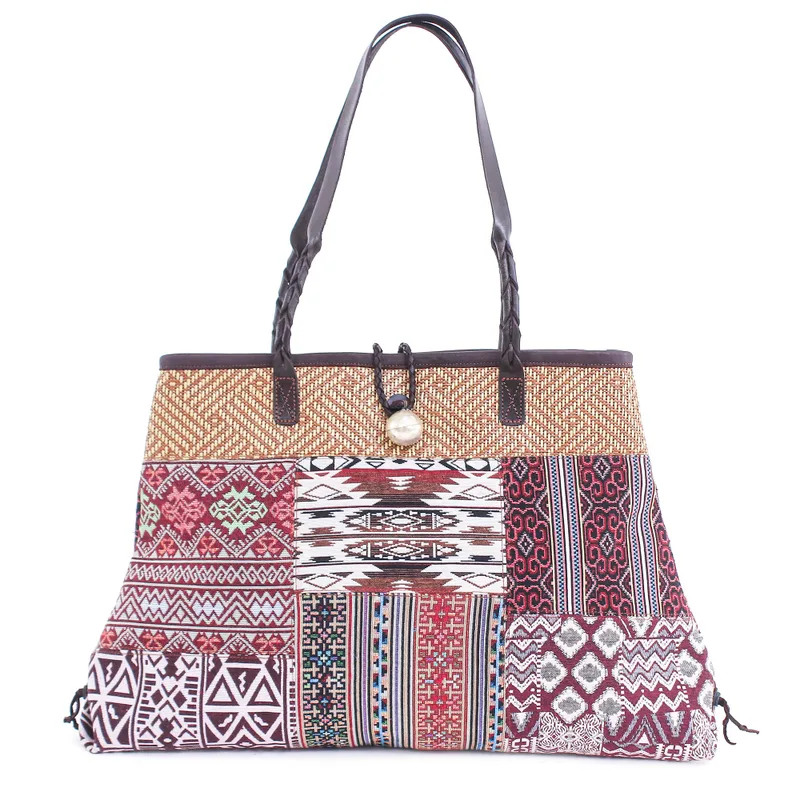 Thai artisan Chirada's gorgeous shoulder bag, crafted with pretty patchwork, is truly one of a kind. Woven from a poly-cotton blend, the bag features lots of contrasting designs and a braided leather handle with matching trim. Inside, one zippered pocket and two open pockets give you a place for odds and ends, while a dark cotton lining keeps things cushioned. A zippered closure, leather button clasp, and aluminum bauble finish the bag with thoughtful details.