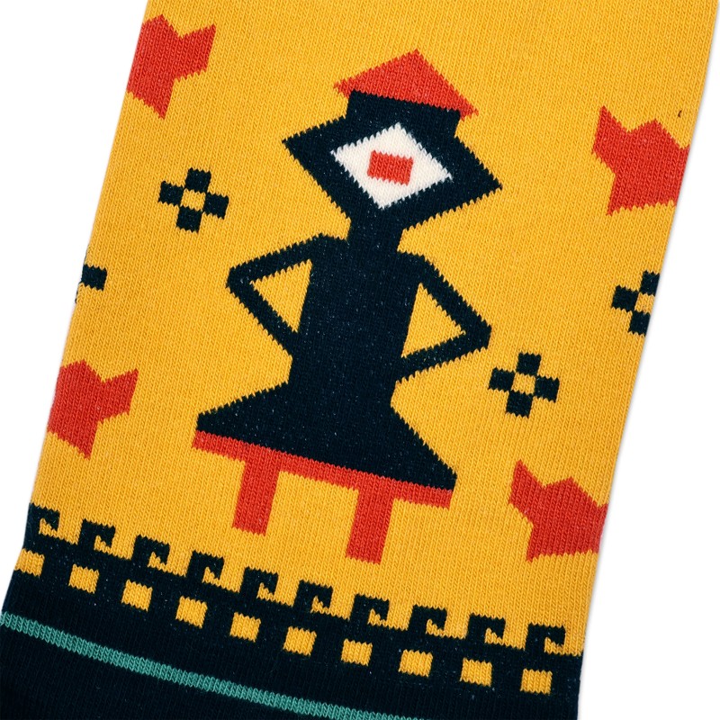 Experience unparalleled coziness with these cotton blend socks brought to life with an exquisite palette of yellow, blue, green and orange tones. An homage to Armenia's rich cultural heritage, these accessories from Daniel Ghazaryan are filled with motifs that whisper tales of antiquity and evoke the intricate patterns found in ancient local carpets and the architectural opulence of the Ahbak province. The unisex socks fit sizes 6 to 9.5.