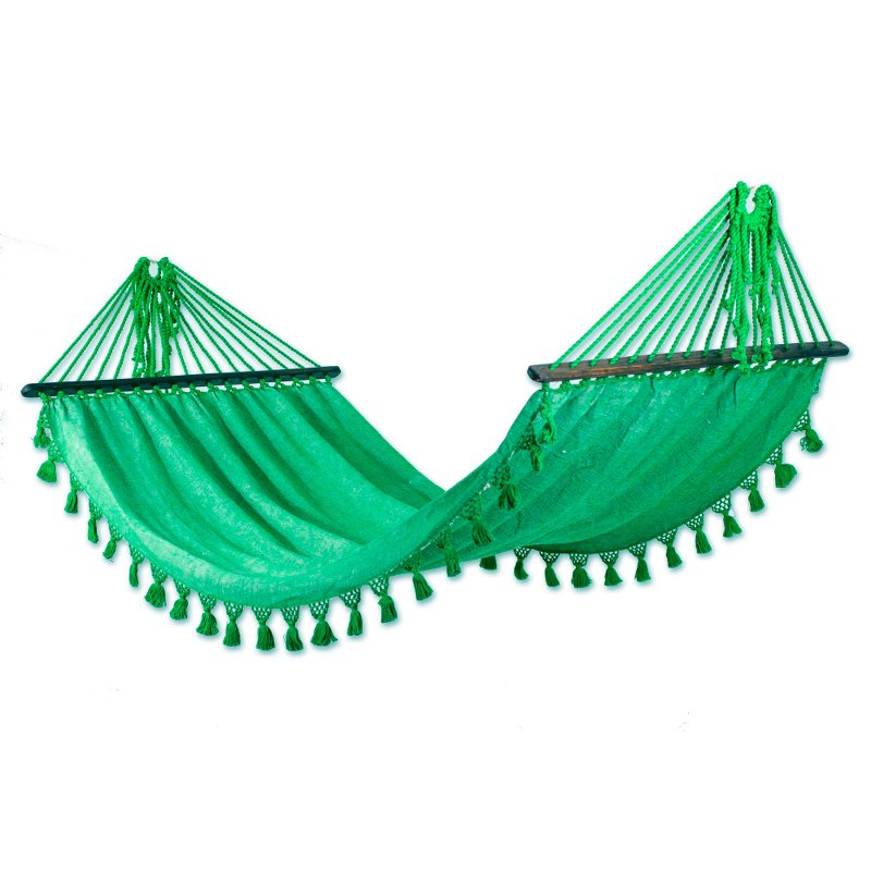 Backed by our 100% Happiness GuaranteeWoven of cool cotton on a pedal loom, this green and ivory hammock holds the promise of sweet relaxation. Estuardo Cofino designs the inviting hammock, which is finished by hand with crocheted borders that end with flirty pompoms. The hammock features pinewood spreader bars and silver-hued brass hoops within the hanging loops.