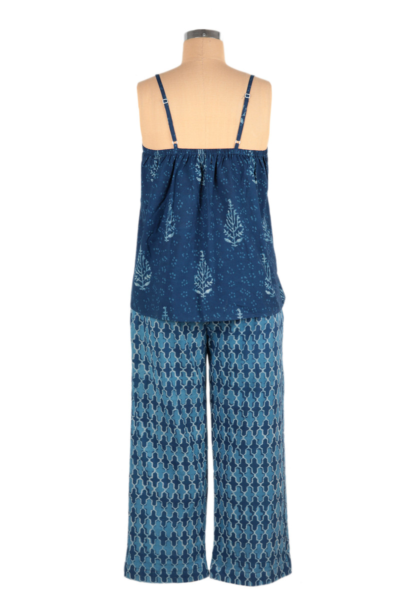 Add a refreshing touch to your wardrobe with this gorgeous creation crafted from cotton by Indian artisan Aftab. In a palette of blue shades, the pajama set includes a camisole with adjustable straps and elastic-waist pants with pockets. Furthermore, each garment presents a complementary design: the top has speckled leafy motifs, and the bottom features a Moroccan trellis pattern, making a unique set.
