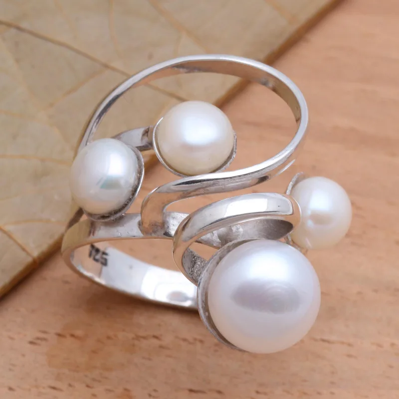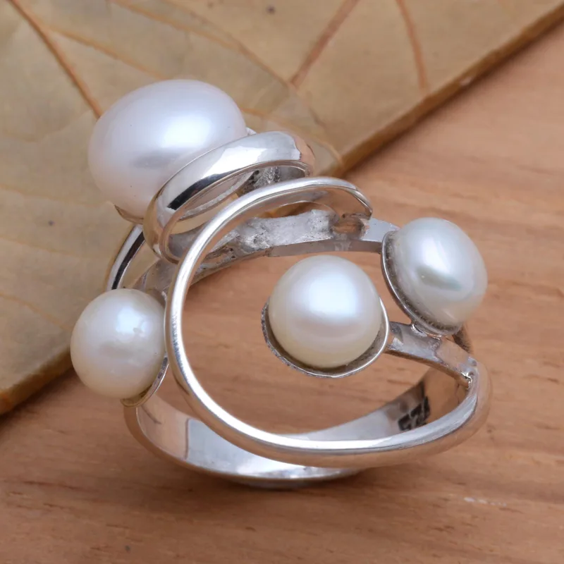 Polished sterling silver whorls and swirls are the perfect setting for creamy white cultured pearls. Budiharta in Bali designs the cocktail ring, which calls to mind the white froth on the crest of a wave.