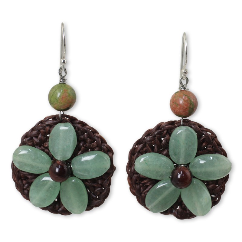 Richly contrasting colors make these beaded earrings from Anusara in Thailand memorable. She adds soft green quartz flowers with tiger's eye centers to hand-crocheted cords in dark brown. The earrings are topped with beads of intriguing unakite. They swing from sterling silver hooks.