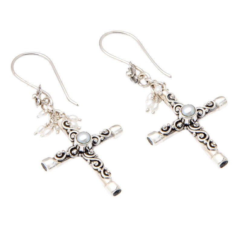 You can find our cultured pearl dangle earrings 'Innocence Cross' by Buana in jewelry categories such as Cross Earrings, Balinese Traditional Silver Earrings, Birthstone Earrings, Gemstone Earrings and Pearl Earrings. Enjoy exploring these sections for other Novica treasures.