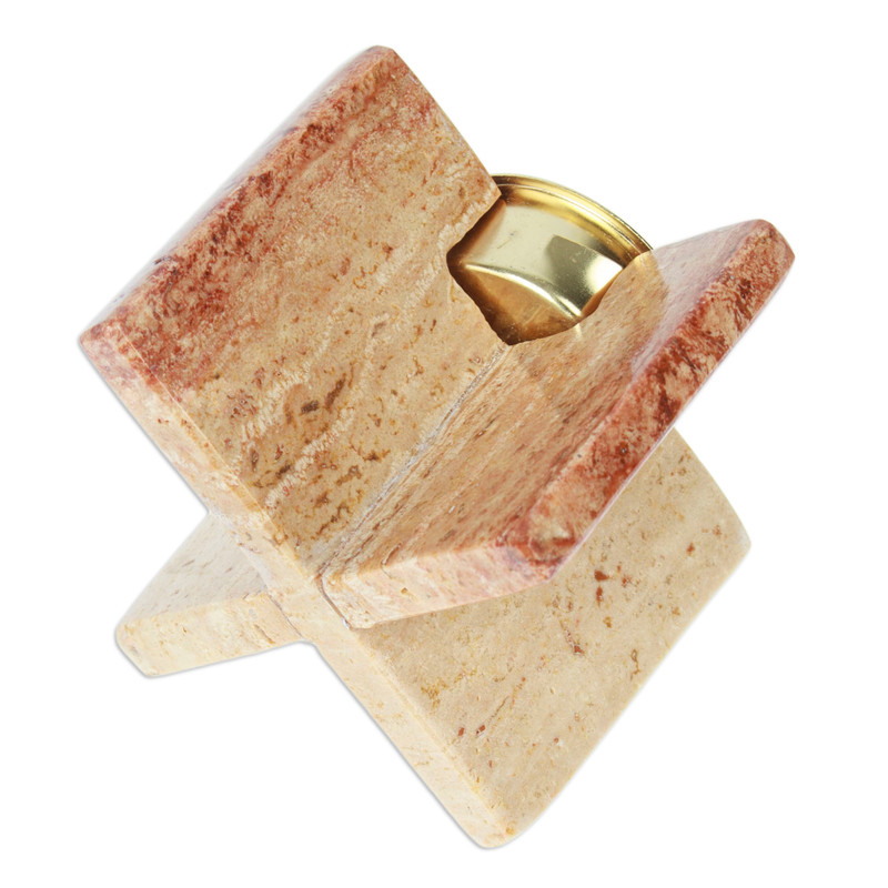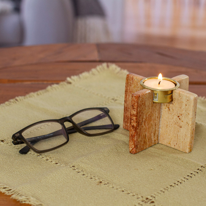 Add warm light to those relaxing moments at home with the Sierra Family's newest creation. Inspired by modern trends, this talented Mexican team works with a natural beige onyx stone to create a cross-shaped tealight candleholder accented with a polished aluminum stand to place your candles securely.