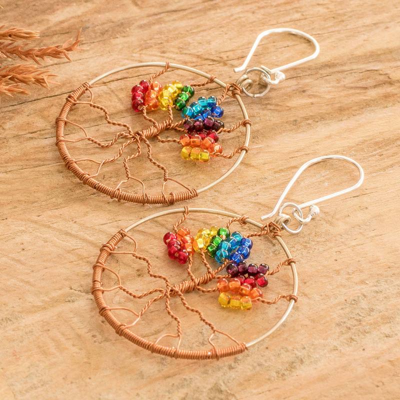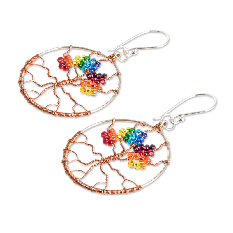 Backed by our 100% Happiness GuaranteeGuatemala's Domingo Reanda takes inspiration from the Tree of Life motif to create a pair of irresistible dangle earrings. A circular stainless steel structure is the canvas he adorns with twisted copper wires to form the tree roots, trunk and branches, using colorful crystal and glass beads as the leaves. Bold and unique, these delightful earrings sway from polished sterling silver hooks.