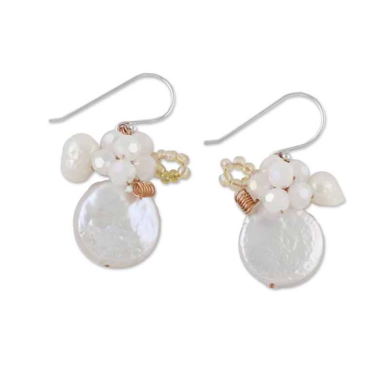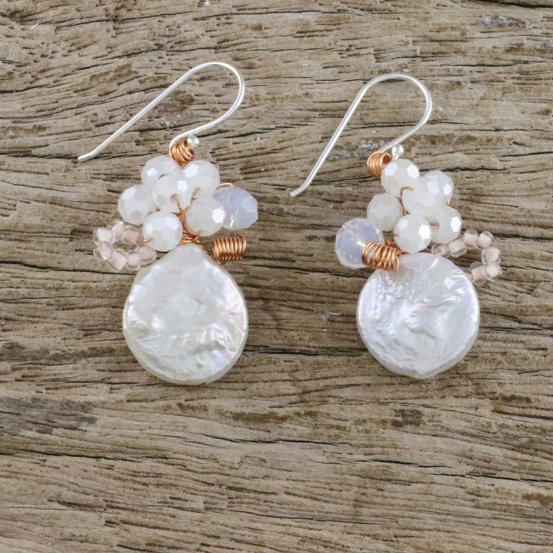 A glamorous cluster of white cultured pearl and glass beads decorates each earring in this Thai accessory, accentuated with copper wire to hang from hooks of sterling silver. Nareerat designs an exemplary pair of dangle earrings, perfect for your next night out.
