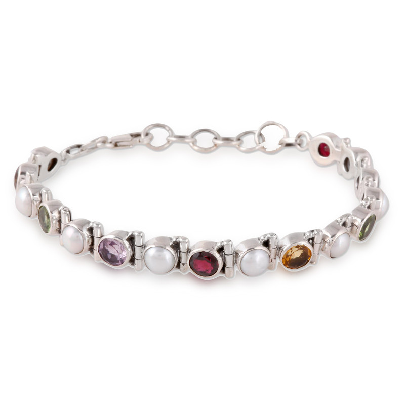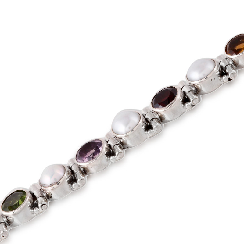 Backed by our 100% Happiness GuaranteeA symbol of purity and grace, cultured pearls alternate with faceted amethyst, citrine, garnet, and peridot that total six carats. This original tennis-style bracelet from Neeru Goel is crafted of sterling silver. Lobster claw clasp