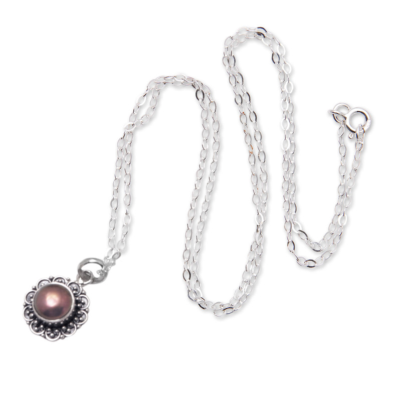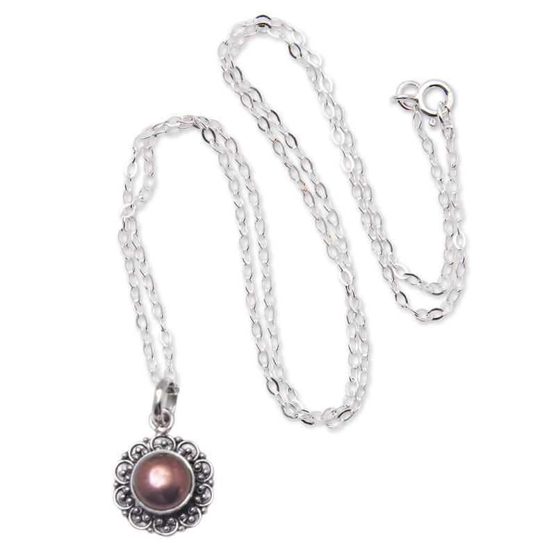 This sterling silver pendant necklace is a versatile and timeless piece of jewelry that will surely become a treasured addition to your collection. The fabulous necklace by Bali's Ketut Sulastri features a captivating brown cultured pearl at its heart, exuding elegance and refinement that is perfectly complemented by the beautiful flower-shaped design. The intricate silver dots and the combination of polished and oxidized finishes that surround the pearl are a testament to the exceptional craftsmanship of Balinese artisans who have mastered the classic granulation technique.