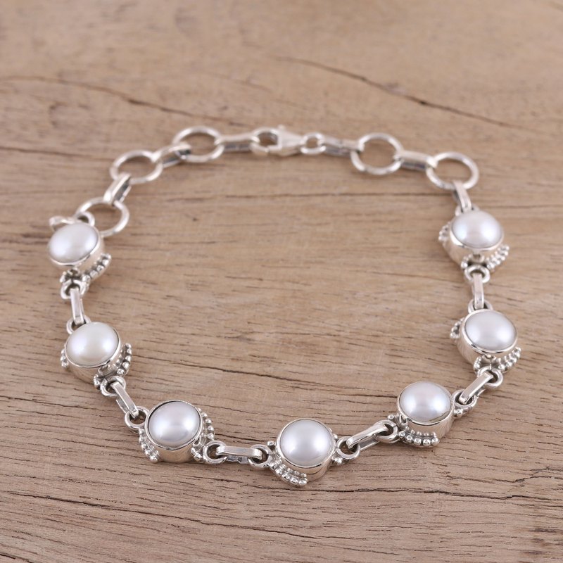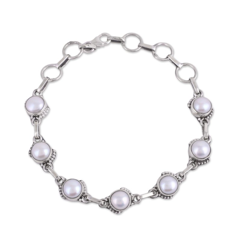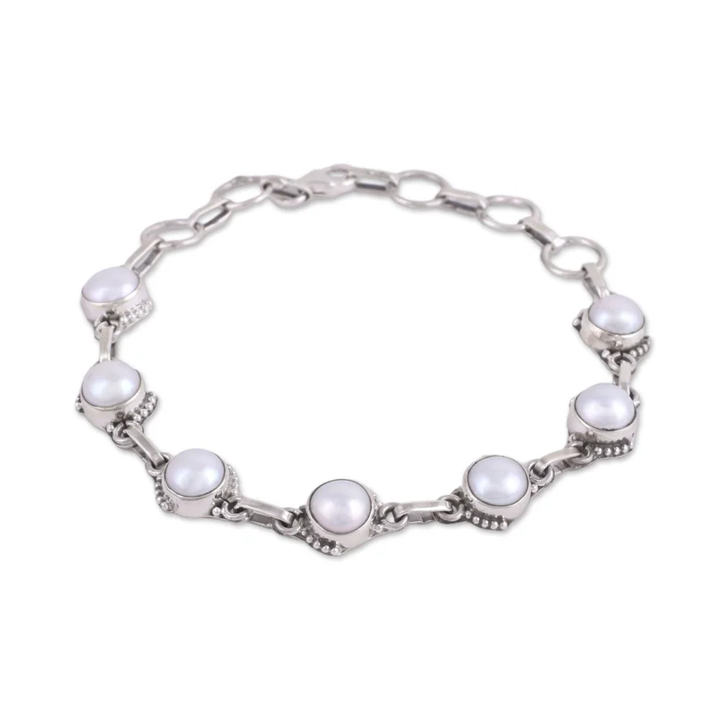 Charming orbs of white cultured pearl circle the wrist, featured in this amazing bracelet presented by Alok Jain. He works with local artisans, who craft the bracelet with sterling silver links that connect the stones. An adjustable length lets this accessory fit the wrist comfortably.