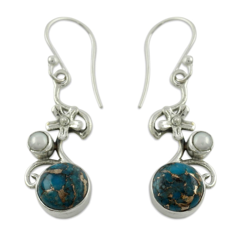 India's Shanker designs earrings of spectacular beauty featuring the creamy iridescence of pearls. Flowers blossom above them while below, blue and gold composite turquoise captivates with its uniqueness. The sterling silver earrings are worn on hooks.