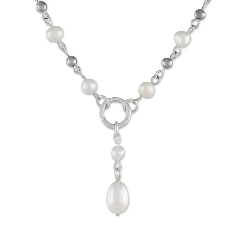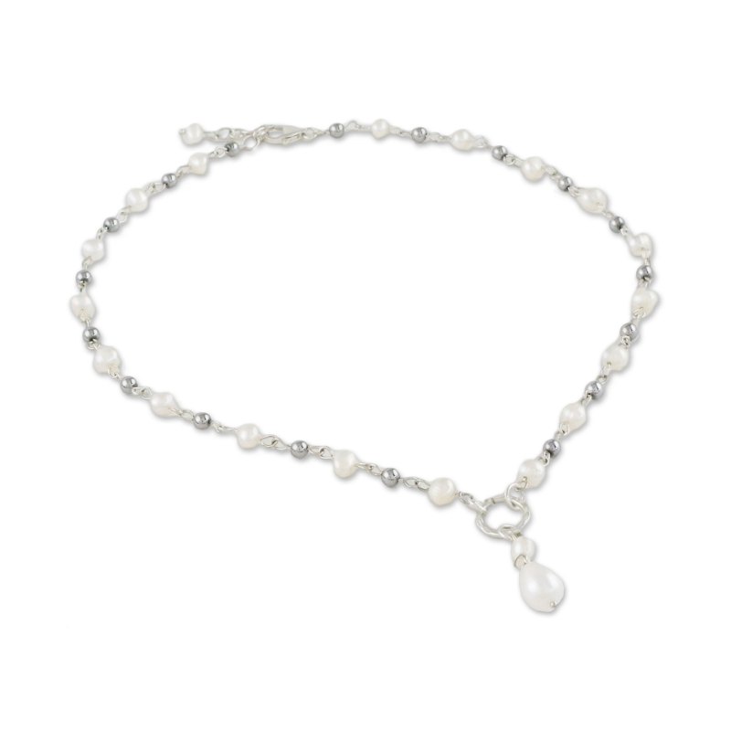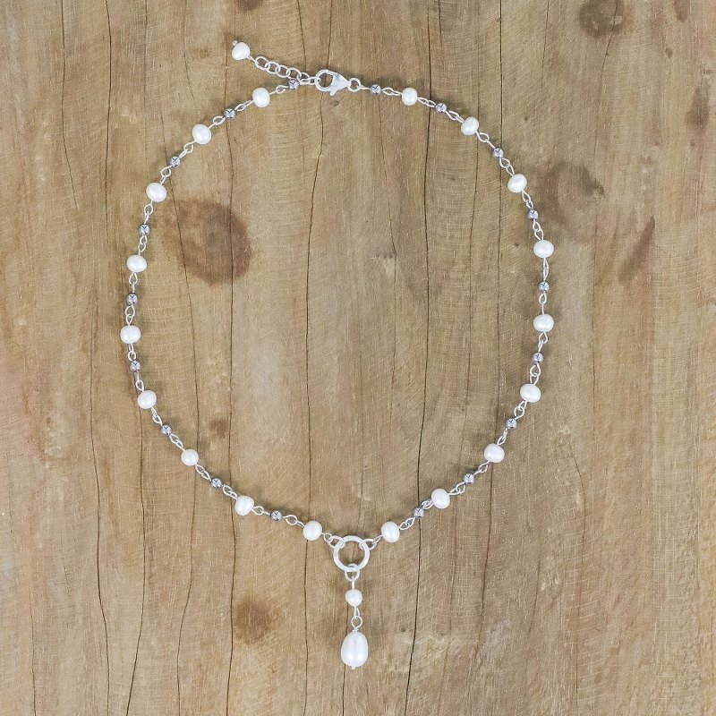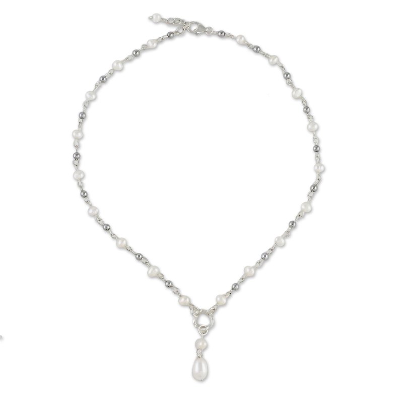 Links of sterling silver circle the neck, elaborated with stations of glowing white cultured pearls and polished hematite. Learning her skills from her family, Thailand's Tipa designs and crafts the necklace, working with local artisans. She centers the necklace with a dangling 950 silver and pearl pendant.