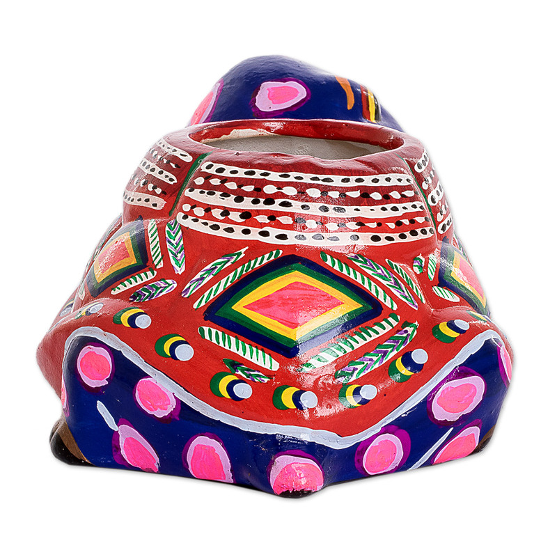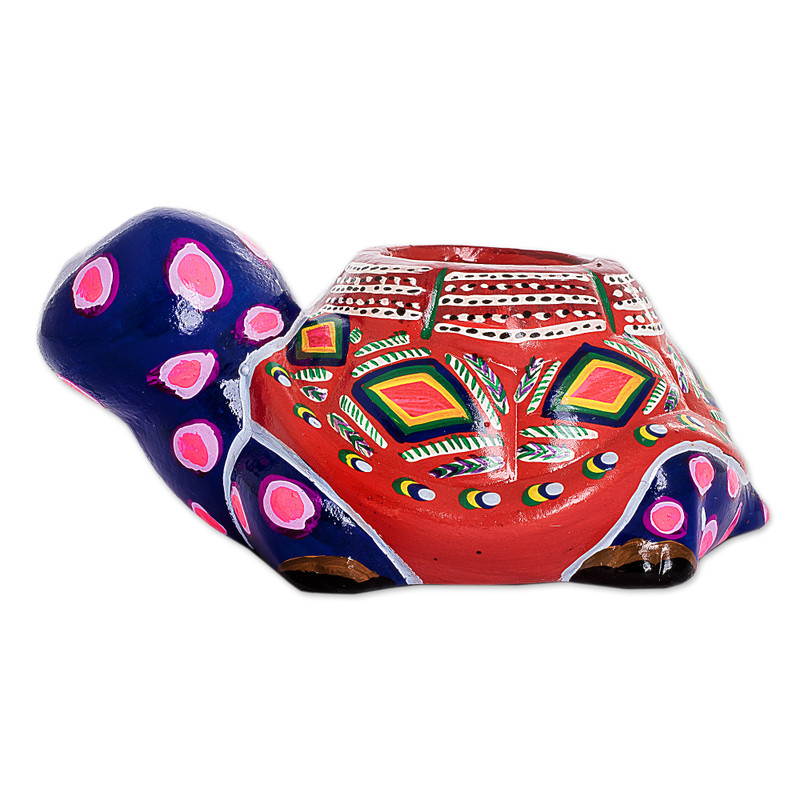 A normal turtle loves to eat greens, but thankfully this ceramic turtle will offer its shell to a little plant, making an adorable flower pot that will add cheer to the day. Guatemala's master ceramic artisan, Vitelio Orozco, incorporates the pottery traditions of Antigua Guatemala into this flower pot, through a time-tested process, starting with molding the clay into the shape of a turtle, then firing it in a kiln at 2000 degrees Fahrenheit, later painting it and covering with varnish.