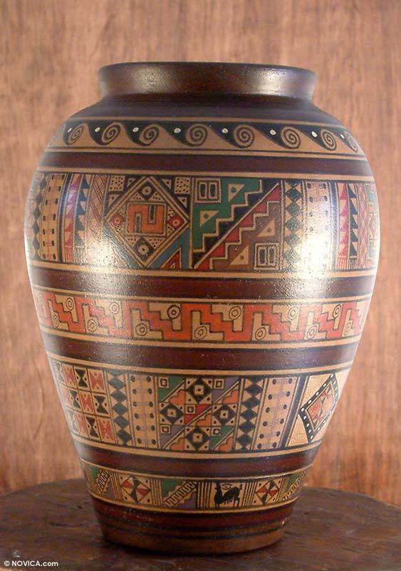 Tiny llamas graze amid ancient temples while ocean waves tell stories of Peru's Pacific coast. The Huaman Paucar Family takes their inspiration from Tambomachay for this beautiful replica. The ancient site was dedicated to the cult of water and the Inca Emperor visited the zone for rest and relaxation. Masterfully reproduced on an aged Cuzco vase, the ancient symbols proclaim Peru's rich heritage.