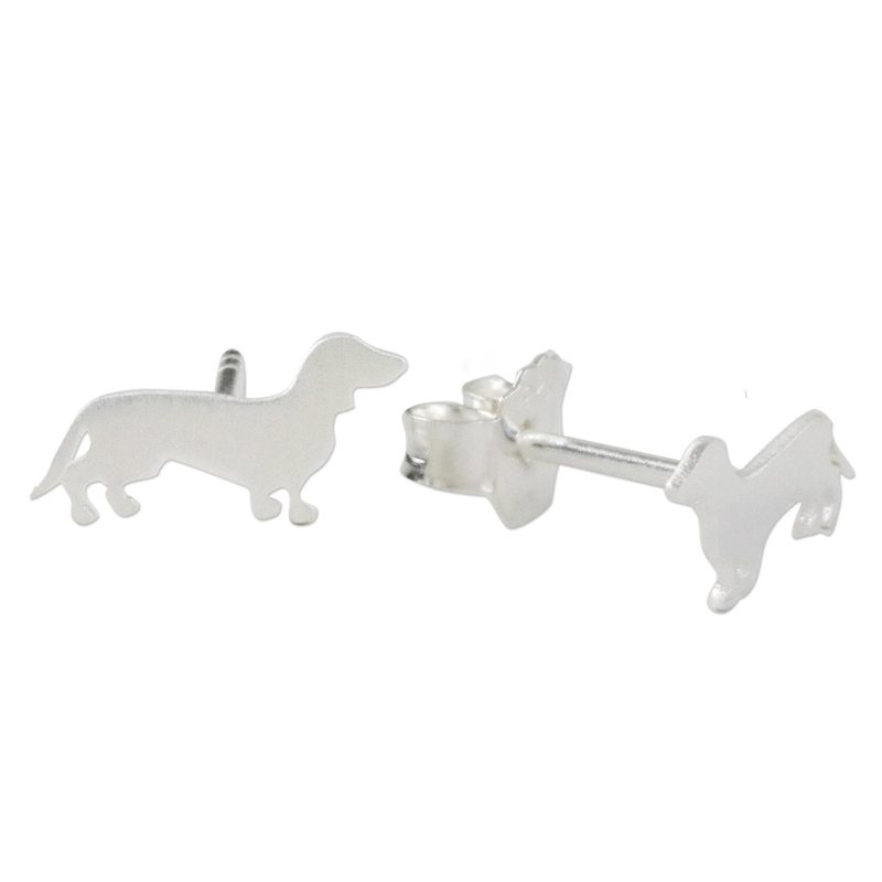 Notable for its strikingly long body, the Dachshund makes an adorable companion wherever it goes. Thai artisan Jantana celebrates this cute dog with a pair of stud earrings, crafted of sterling silver to resemble its form in profile. A brushed-satin finish accentuates each earring.
