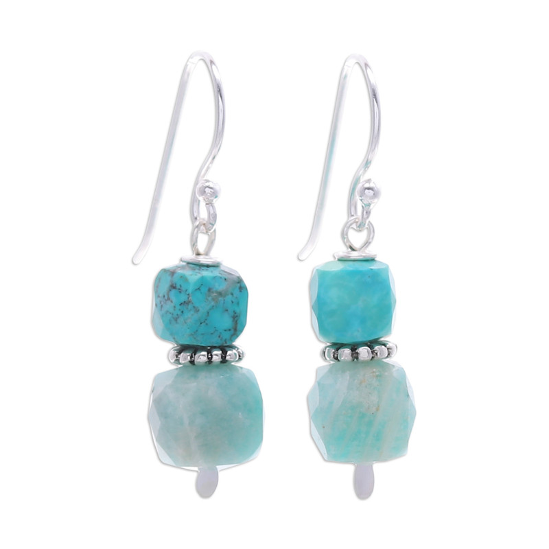 Backed by our 100% Happiness GuaranteeThai artisan Sareeyakarn draws inspiration from precious jewels to create a breathtaking accessory full of symbolism. Working with sterling silver, the artisan aligns reconstituted turquoise and amazonite beads in these dangle earrings believed to attract success and luck.