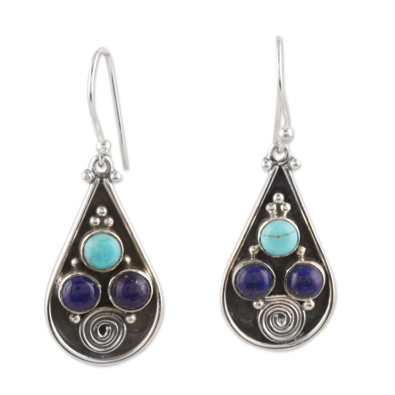 Indian artisans put advanced metalwork techniques into practice to create these sterling silver dangle earrings featuring a traditional design. The accessory, presented by Alok Jain, comes in a combination finish that enhances the braided motifs, also crowned with reconstituted turquoise gems and lapis lazuli jewels, symbolizing royalty.