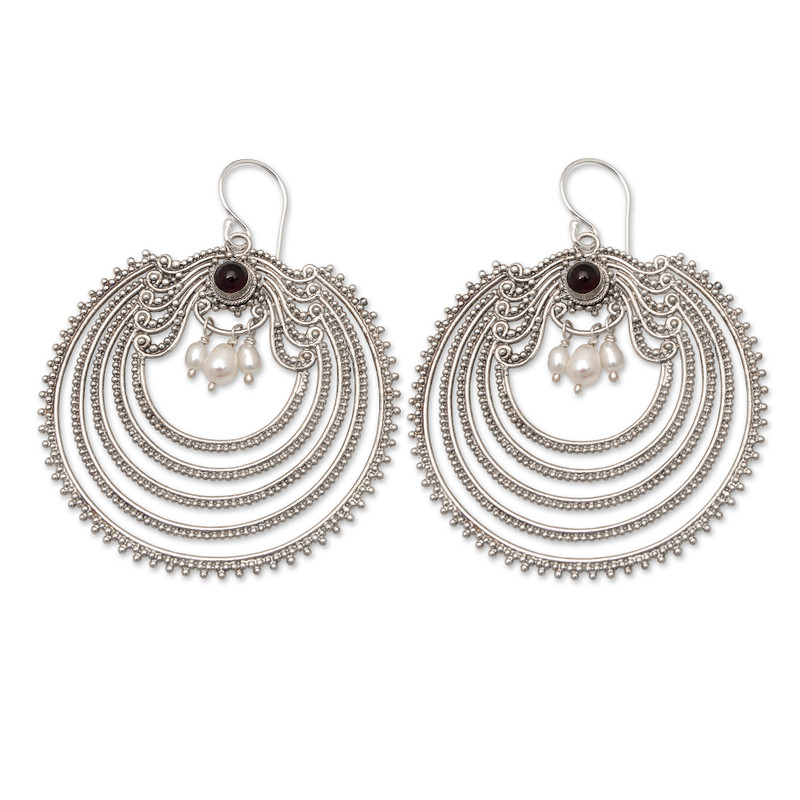 Ketut Sulastri reaches a new pinnacle of glamour with her latest creation, aimed at honoring Bali's unique elegance. The artisan puts advanced metalworking techniques into practice to create the round structures that form these dangle earrings, featuring beads all over the design and classic windy accents. As the main elements, natural garnet cabochons crown the design, symbolizing passion and perseverance. The final touch is in the cultured pearls in a silver-white hue, representing the region's marine wealth.