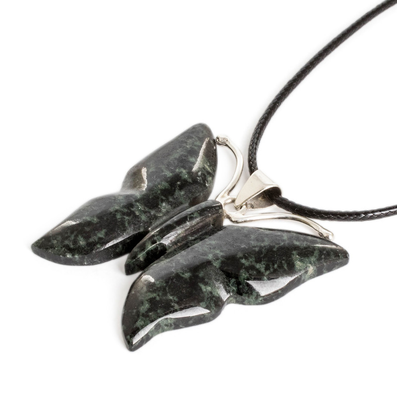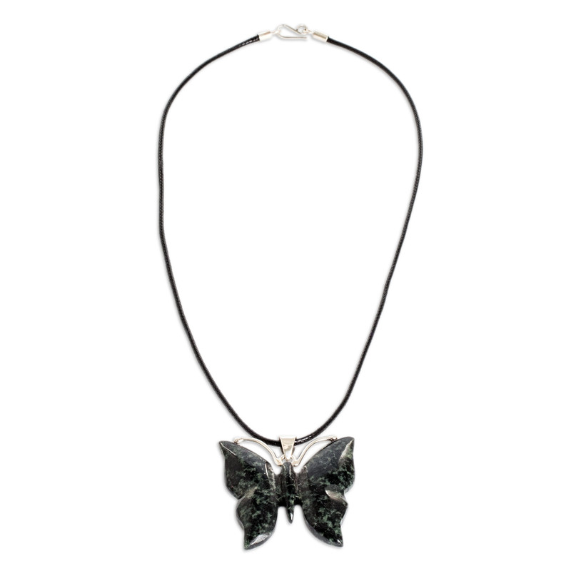 A mystic butterfly flutters around dark green jade hues of puissant beauty. This sublime pendant, crafted by Guatemalan artisans Ruben and Gilda Perez, dangles from a comfortable cotton cord. Sterling silver accents infuse the piece with sophistication—typical of Guatemala's jewelry artistry.