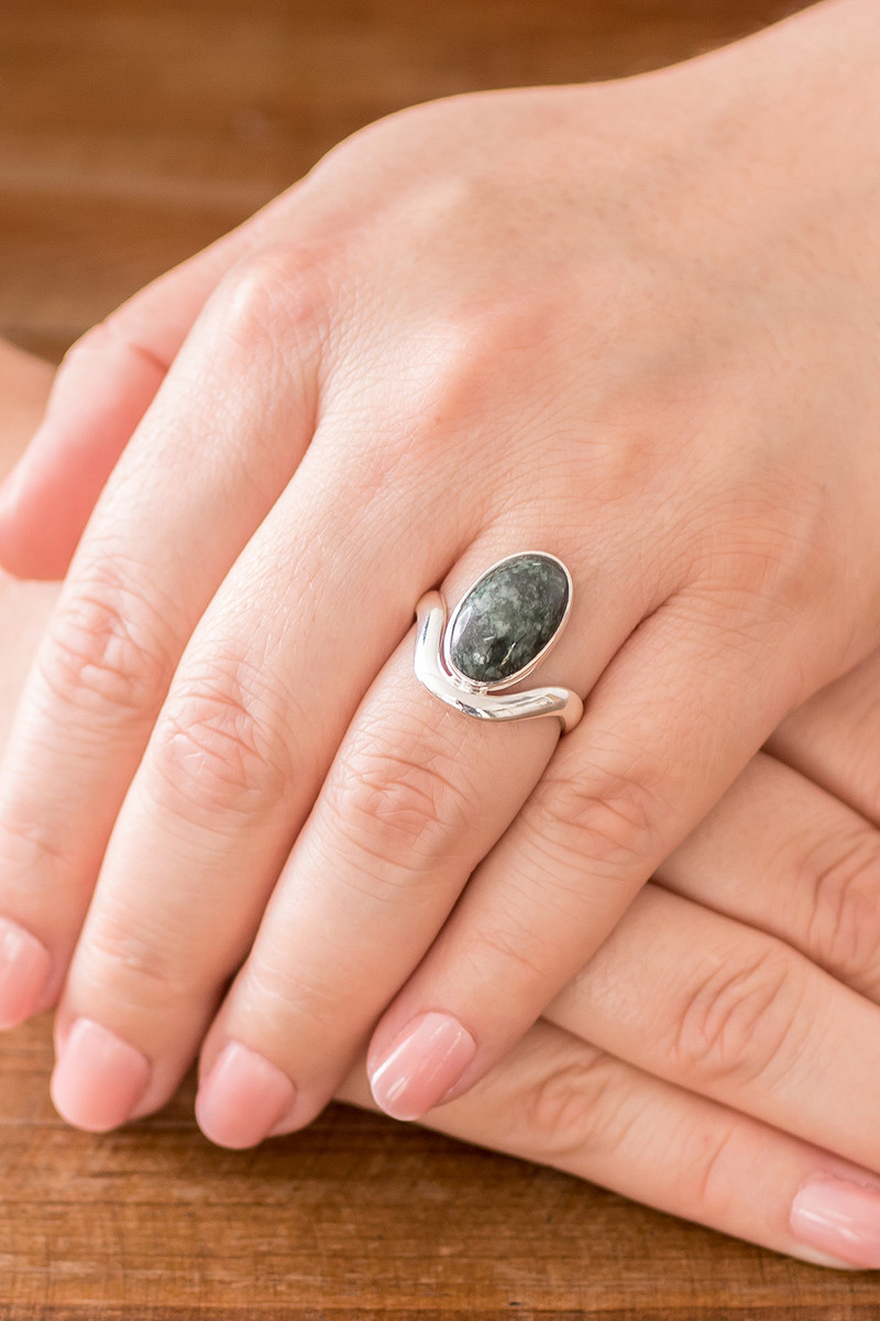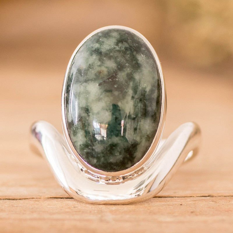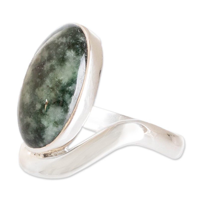 "Jade originates within the earth to dazzle all who wear it. The mixture of minerals and time make of jade a highly valued treasure. The design of this ring symbolizes how jade emerges from the earth," says the Jimenez Family of their original creation. They craft the sterling silver ring by hand, a powerful design rendered in aesthetic minimalism.