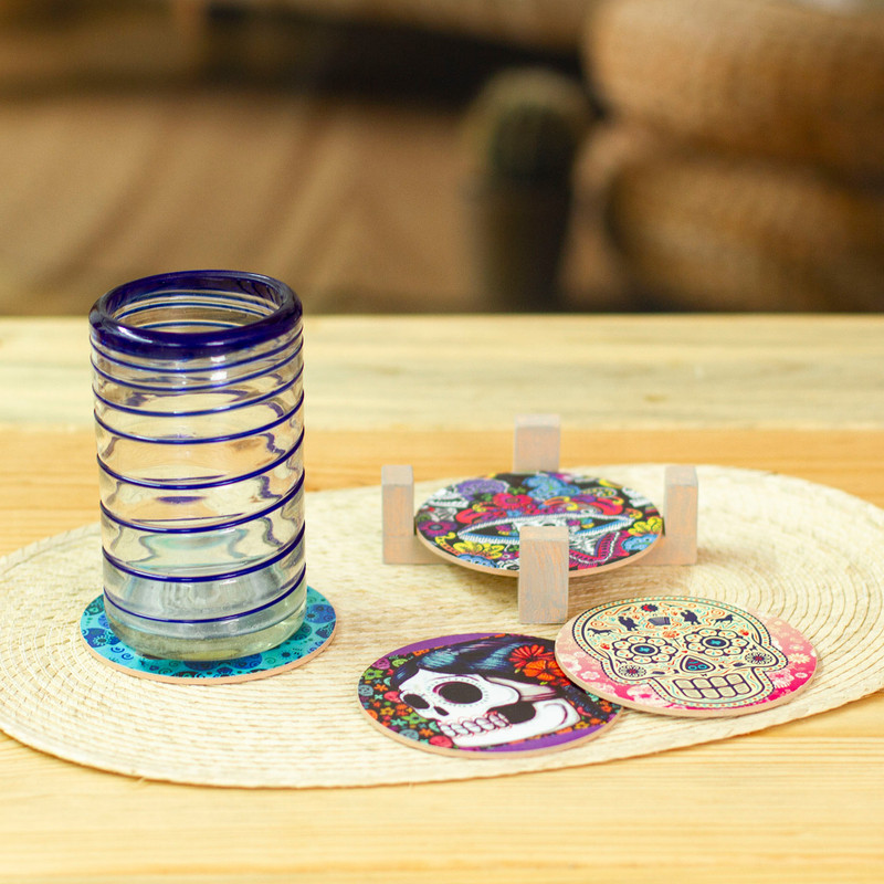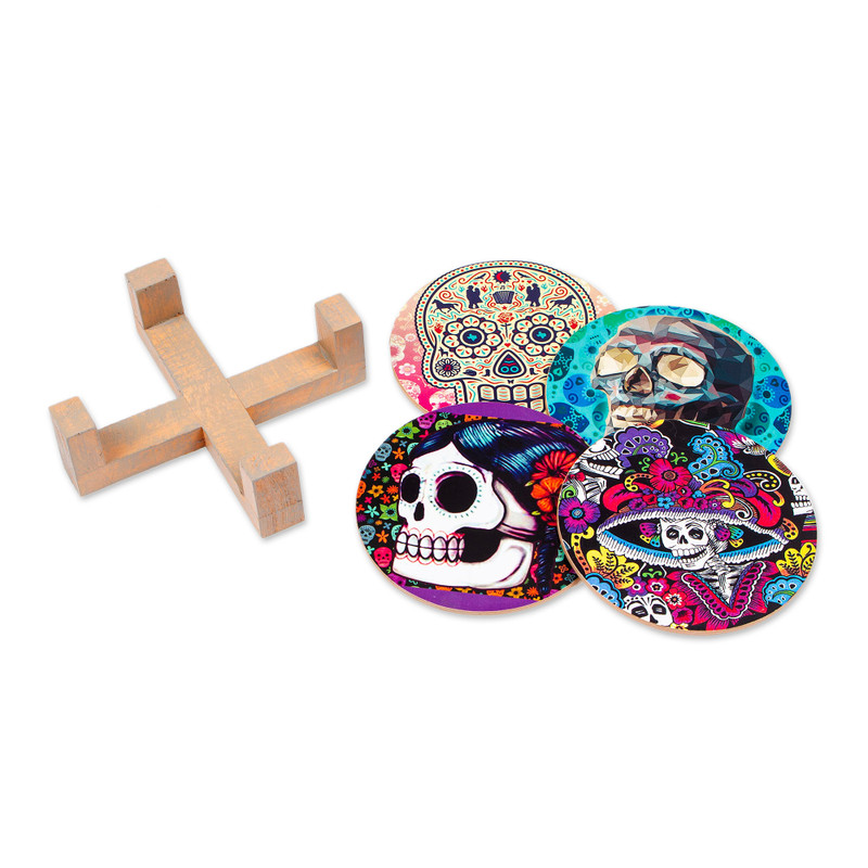 Skull images celebrate Mexico's Day of the dead in colorful coasters by Ana Maria Gonzalez. Working in decoupage on pinewood, she depicts the flirty Catrina in her feathered hat, a sugar skull, a bony skeleton with flowers in her hair and a geometric skull. The set of four arrives with a pinewood stand for storage and display.