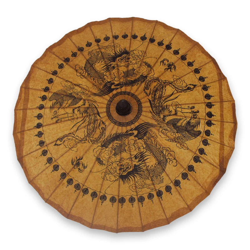 Ancient Asian characters inspire Nikom in the design of this decorative parasol. The Thai artisan uses screenprinting techniques on paper to evoke powerful dragons and mystical phoenixes. The handcrafted parasol features a bamboo frame.