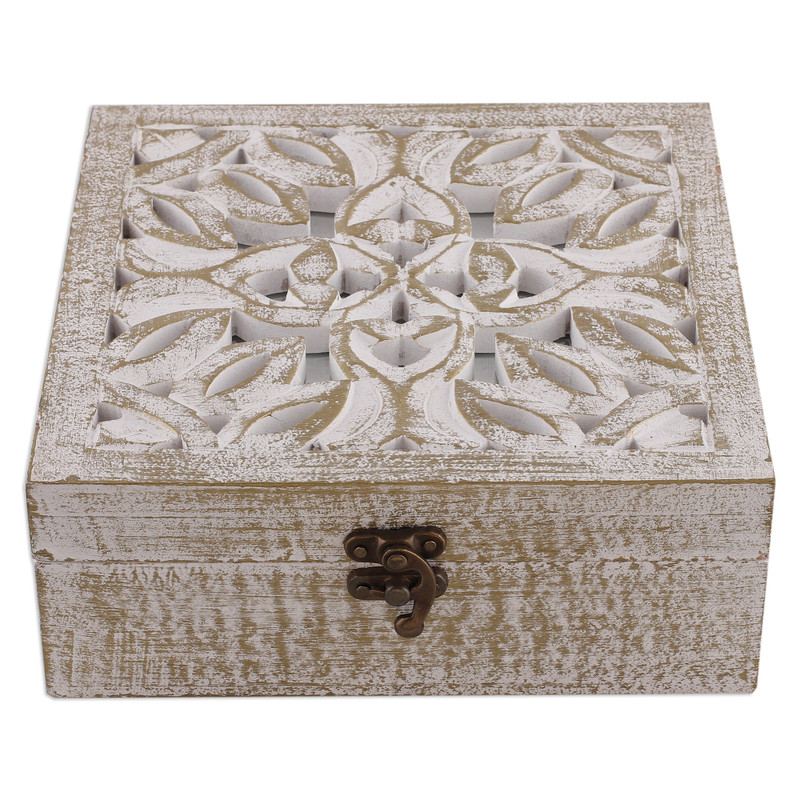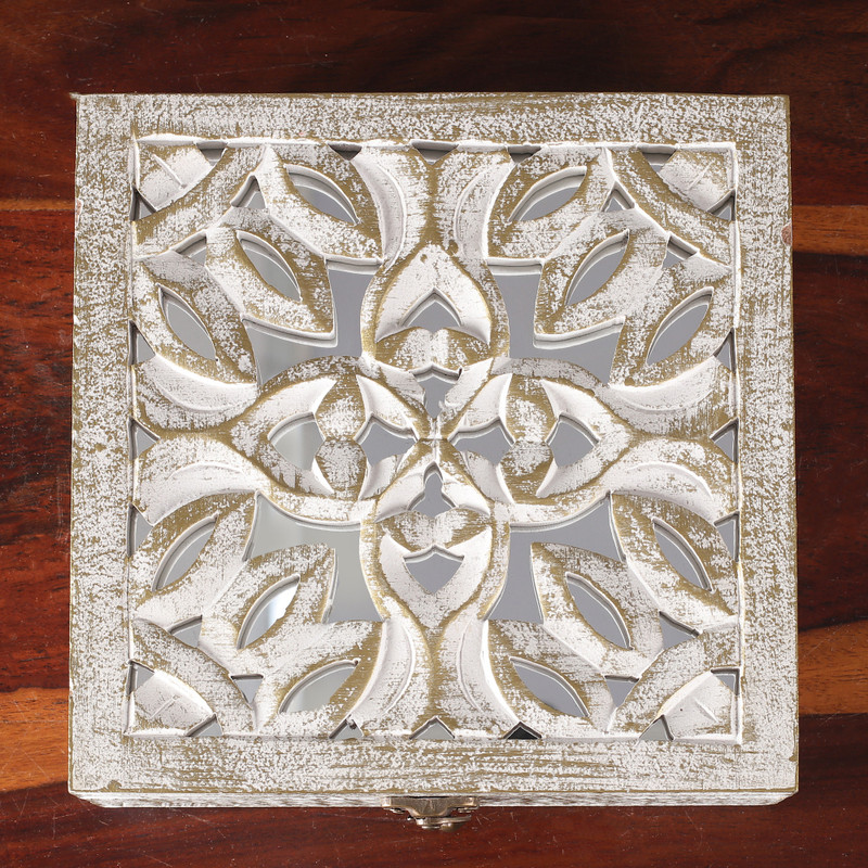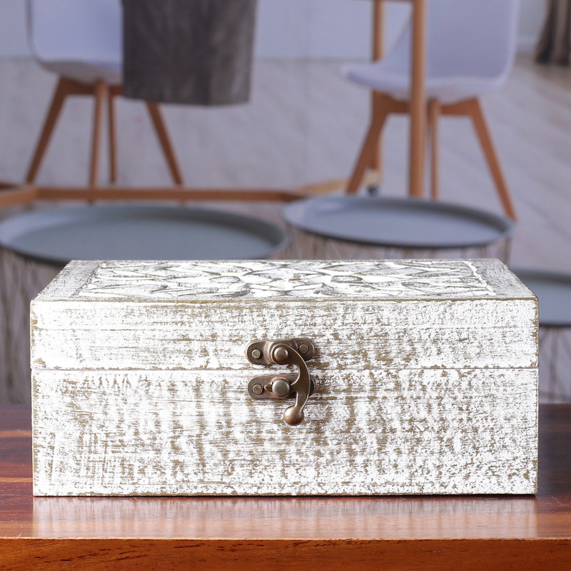 Decorate your spaces with India's classic aura. Made in a distressed finish, Arti Sharma's mango wood decorative box combines white and golden hues in a leafy-patterned carving, reminiscent of the great Bollywood palaces. Accented with a mirror, the piece offers a generous space secured by a classic latch.