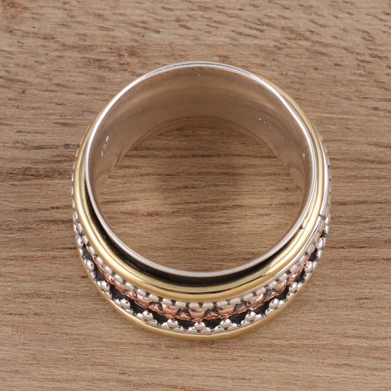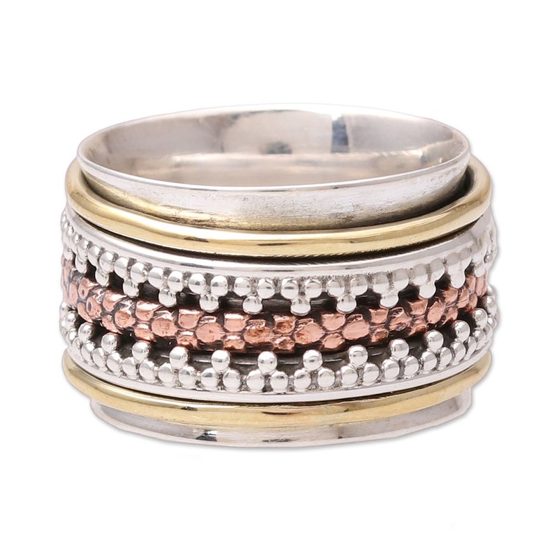 Backed by our 100% Happiness GuaranteeFeaturing dot patterns, two spinning bands of sterling silver and one copper band are flanked by gleaming brass. Indian artisan Neetu Barathi designs this entrancing spinner ring, circling the finger with a wide band of sterling silver.