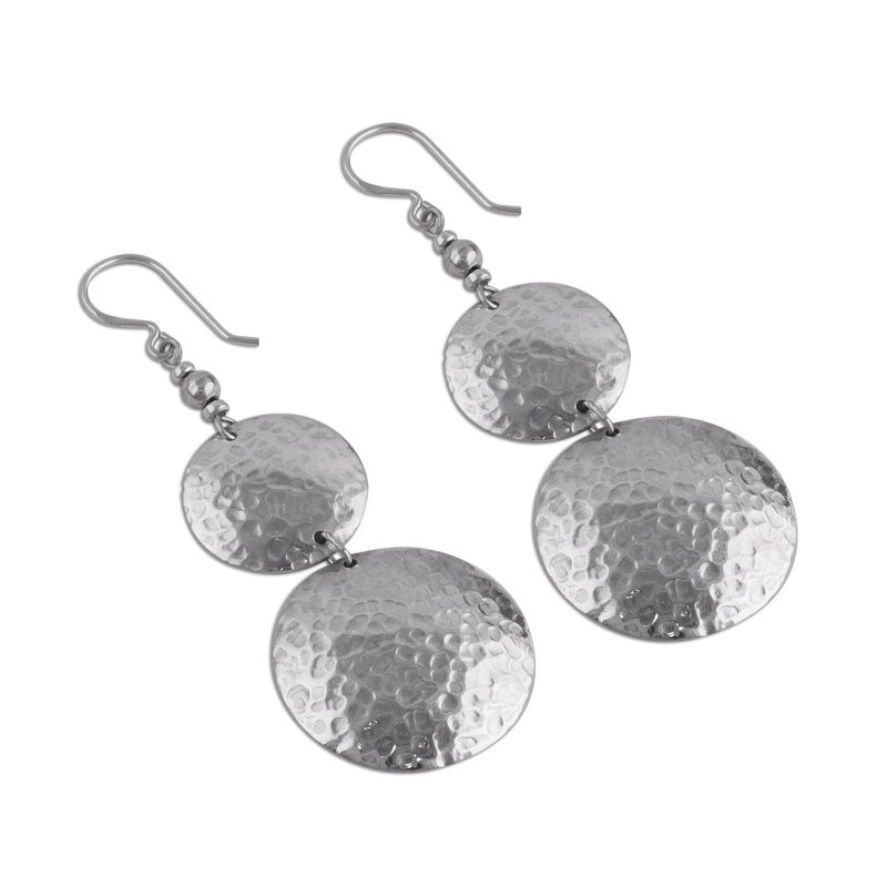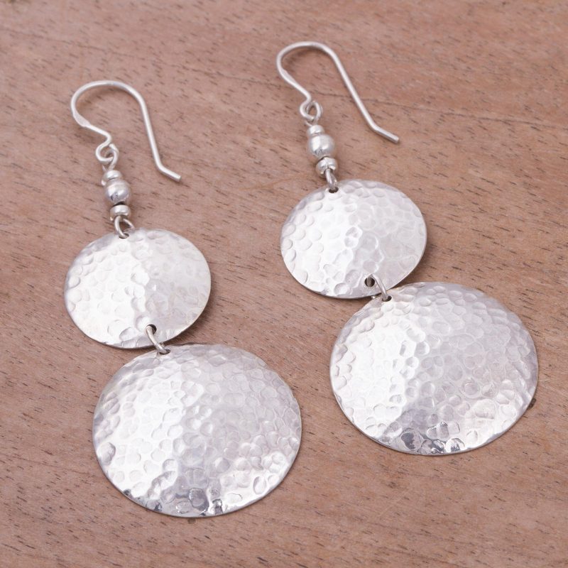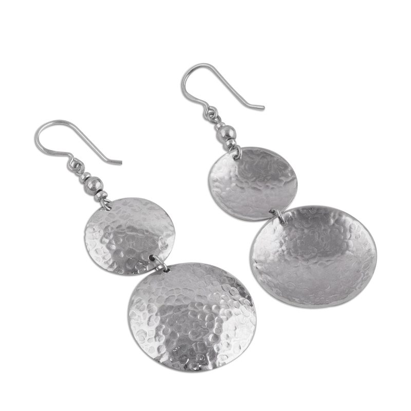 Evoking the moon which stands sentry all night, two luminous disks glisten and shimmer as they catch the light. Teodoro Melendez and Family of Peru craft this pair of sophisticated dangle earrings in sterling silver with a hammered finish. The perfect accessory for a big night out, these hook earrings will also elevate a more casual outfit to a new level.