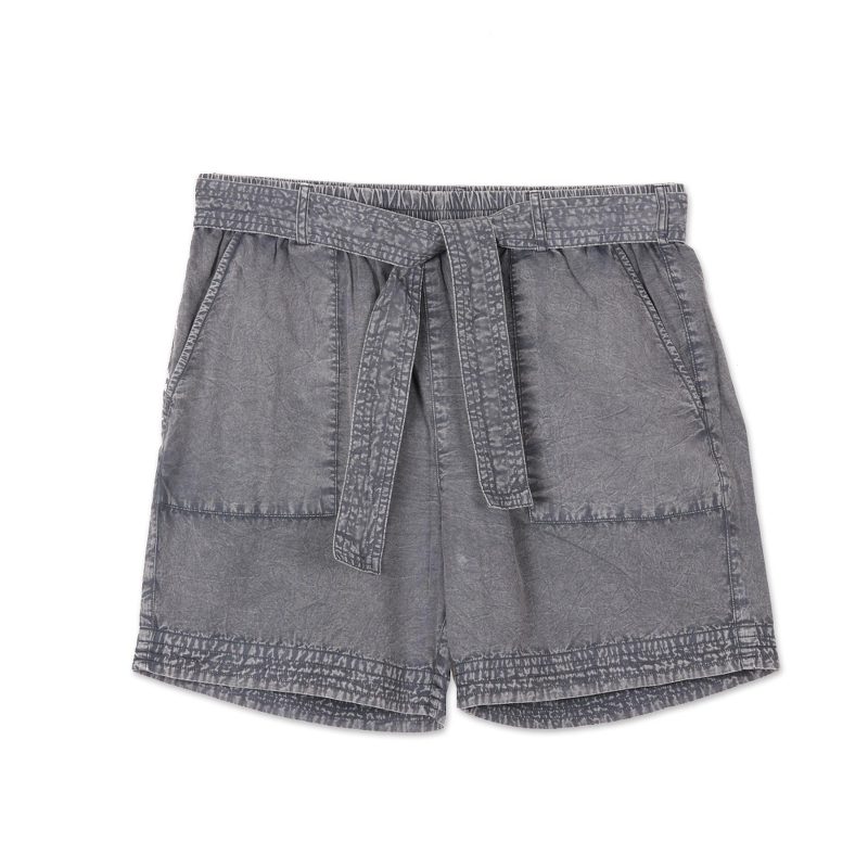 Relax in style during the spring and summer months with cotton shorts from India. Sandip Agarwal creates this design, which is overdyed in slate grey and washed to give a relaxed, aged look. They feature square patch pockets and an elastic waist with a removable tie belt.