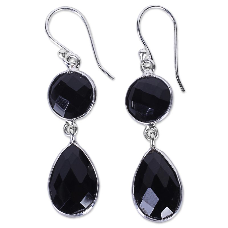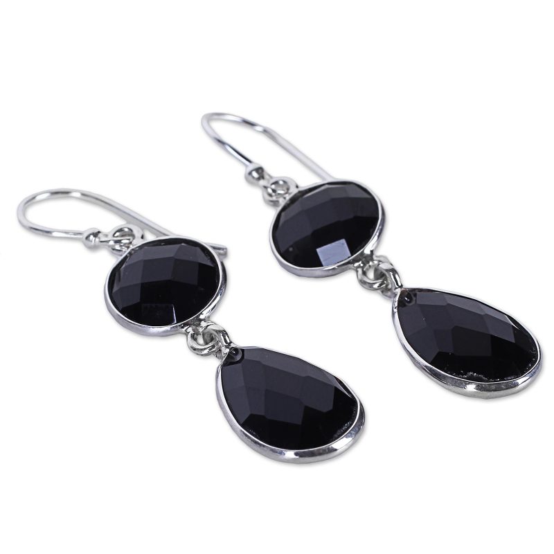 The magical charm of onyx shines through in these mesmerizing dangle earrings presented by Alok Jain of India. A teardrop faceted black onyx gemstone is suspended by a second faceted round onyx stone. The sterling silver hooks and settings come in a high polish finish that complements the earrings' magical feel.