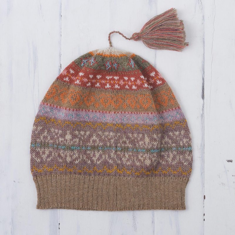 Backed by our 100% Happiness GuaranteeEvoking the textiles of the ancient Inca, this hat is created by Ana Fernandez in Peru. She selects luxuriously soft 100% alpaca wool, which she uses to knit this lovely cold weather hat. It features stripes and vine patterns in taupe and other hues. A tassel dangles from the top of this hat.
