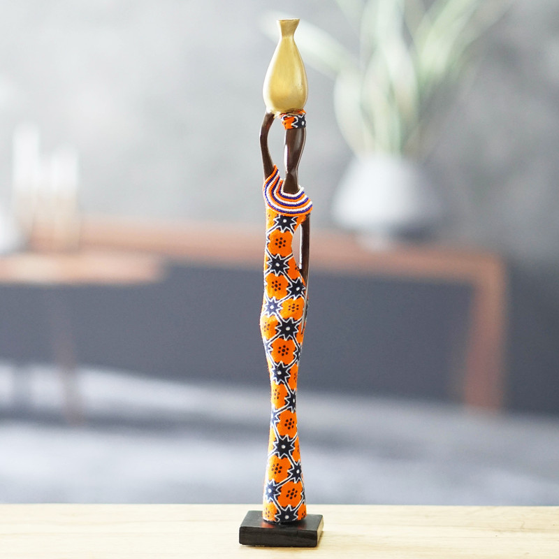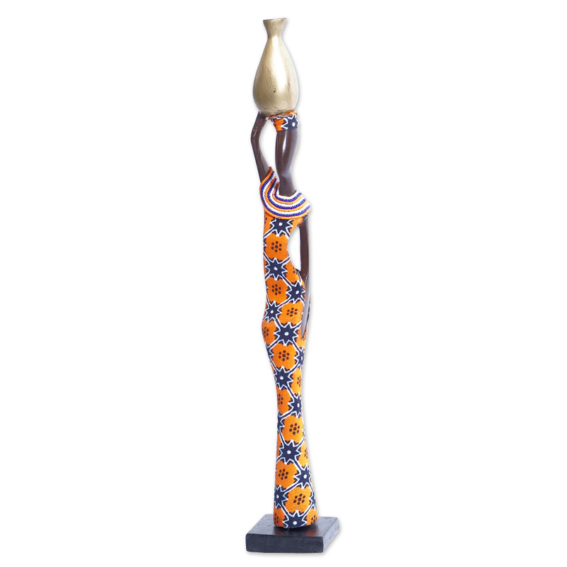 A woman carrying a golden pot and beautifully dressed in Ghanaian attire featuring bright orange and midnight blue motifs is the protagonist of this captivating sculpture carved by hand from ebony wood. Anna Yawson's design is embellished with cotton and recycled glass bead accents that make the sculpture even more alluring.