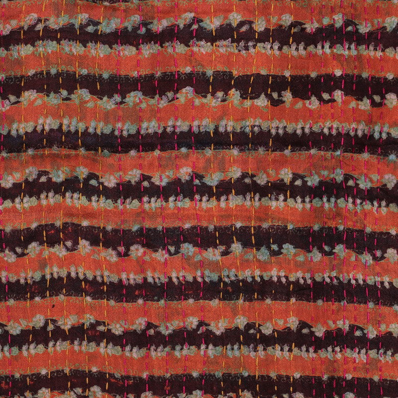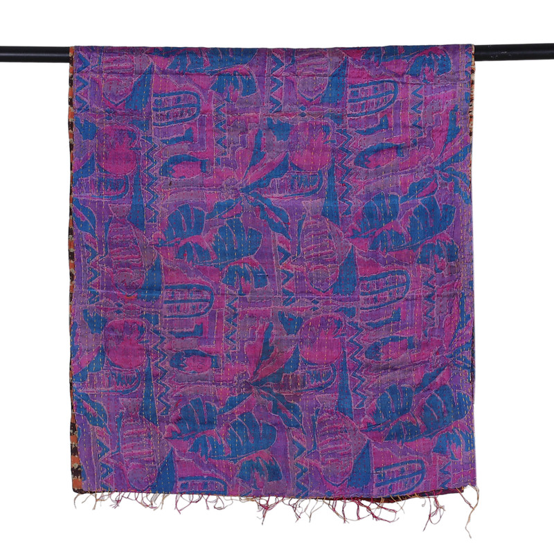 Let your spirit be bold and free with this stunning creation from India. Rajveer presents this silk scarf, adorned with classic Kantha embroidery details made of cotton yarns. Flexible and reversible, the garment boasts a striped side and a chic pattern in purple, pink and blue hues.