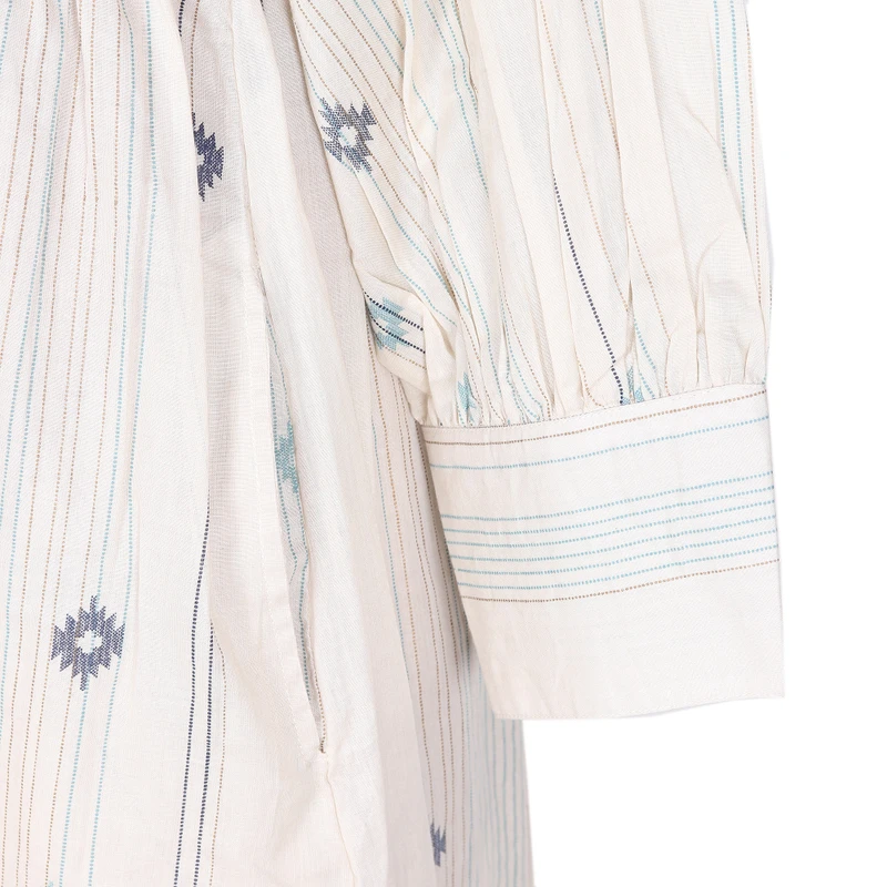 India's Jay Kumar Maheswari designs an enchanting shift dress. Crafted from cotton, this gorgeous garment comes in a solid ecru tone with printed motifs in a palette of turquoise and blue. It also features pockets on each side, long sleeves with buttons on the cuffs and an elegant V-neckline.
