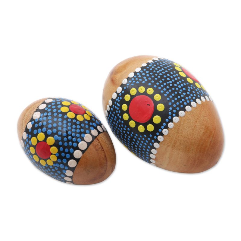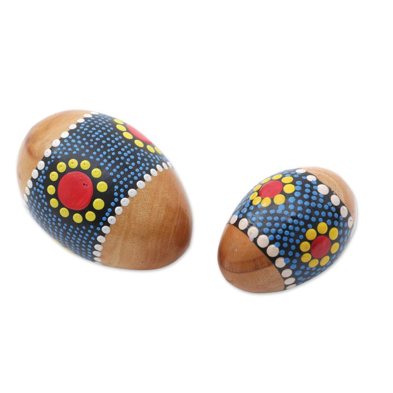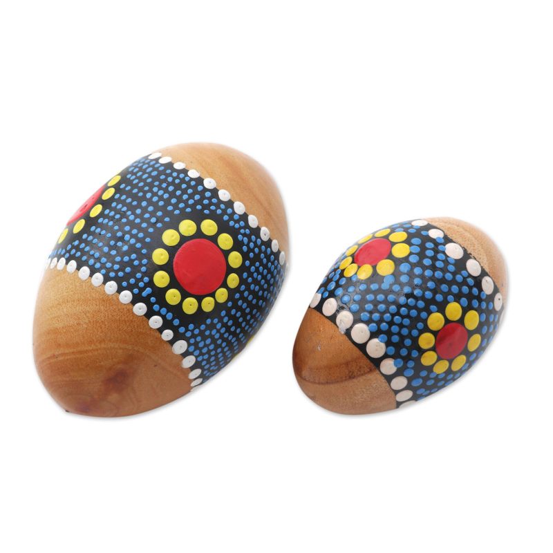 Handcrafted of rich mahogany wood, these two percussion instruments are presented by Balinese artisan Trisna Dewi. Crafted in the shape of a large and a small egg, the shakers are finished with hand-painted designs.