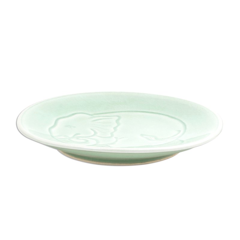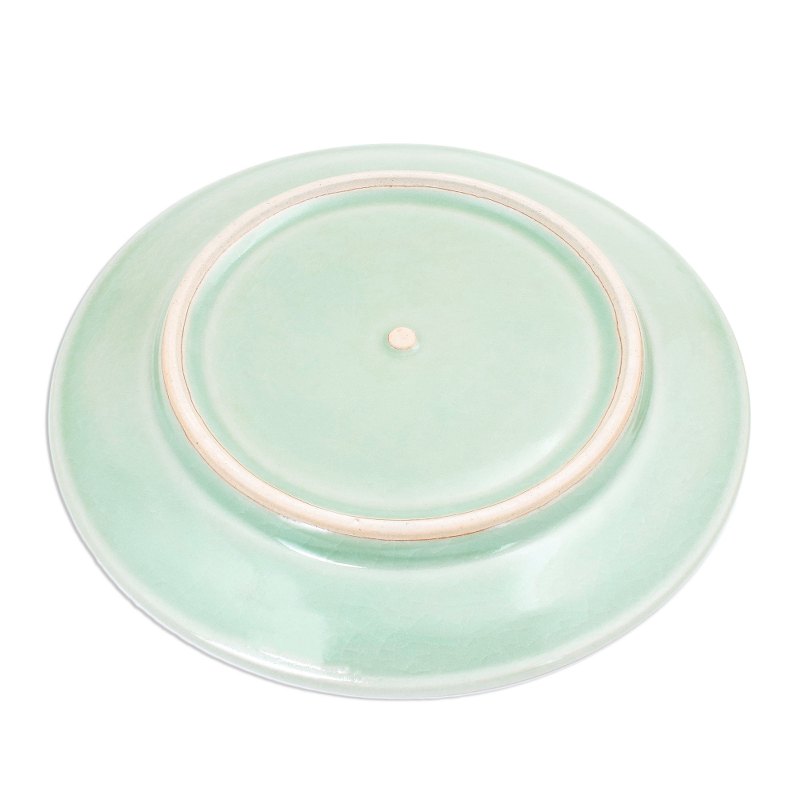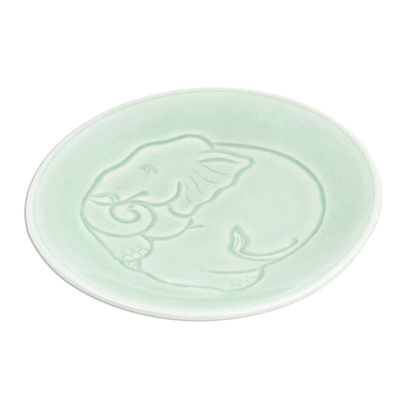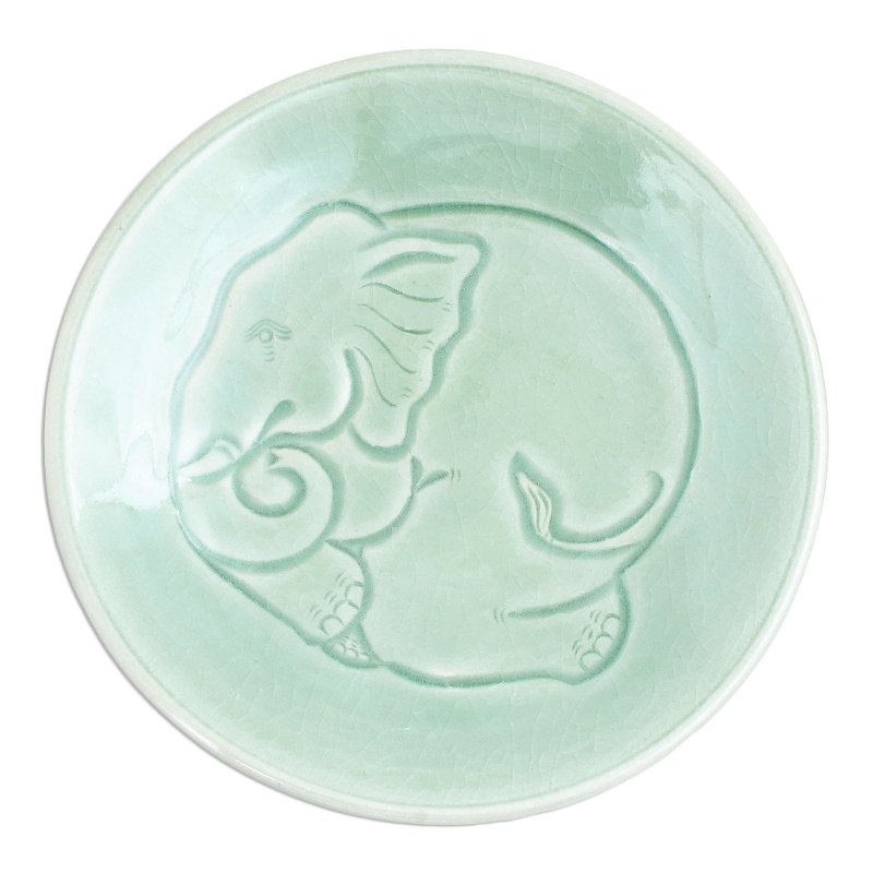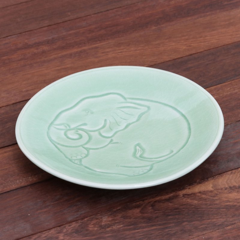 Depicted in silhouette, an elephant is a symbol of Old Siam. It graces a salad plate by Thatsanee and Ramphan. They work in Thailand's celadon ceramic technique, and the glaze reveals the crackled finish of true celadon.