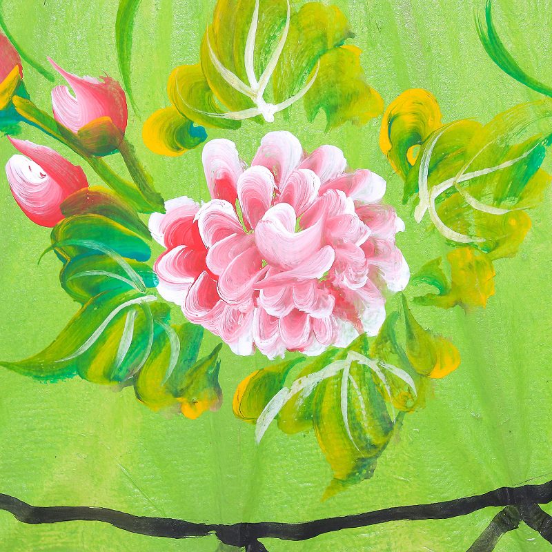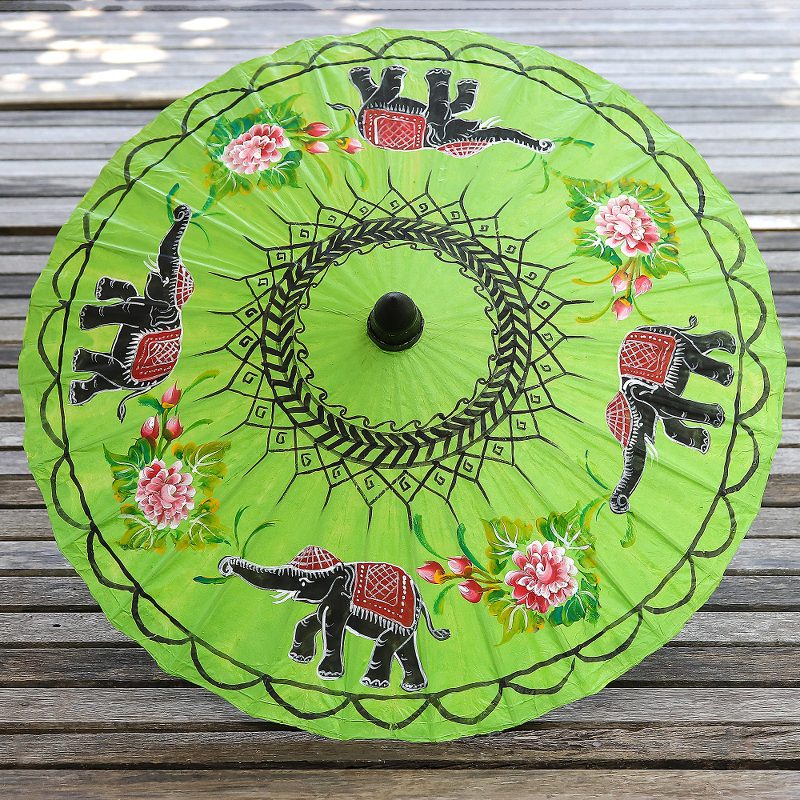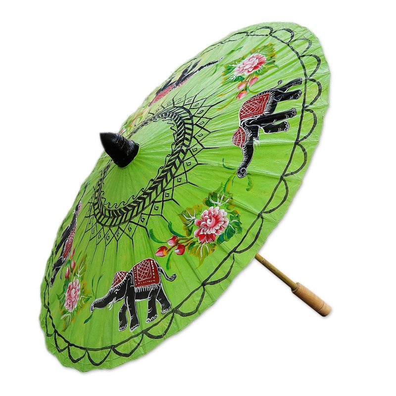 Royal Thai elephants alternate with pink flowers in a mystical lime green world. By Nikom, this charming parasol is crafted of bamboo and handmade saa, or mulberry bark paper.