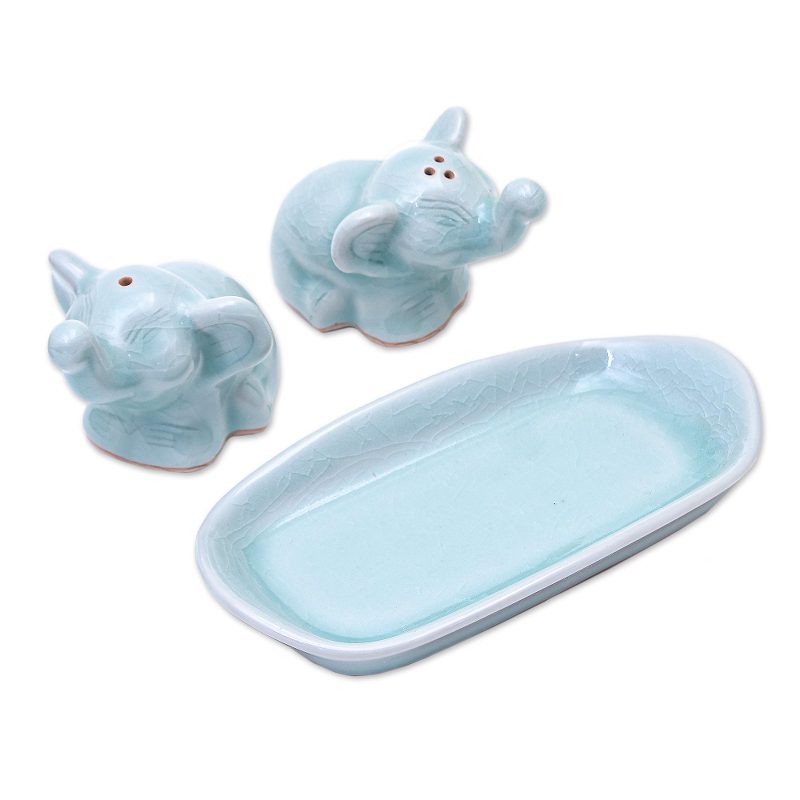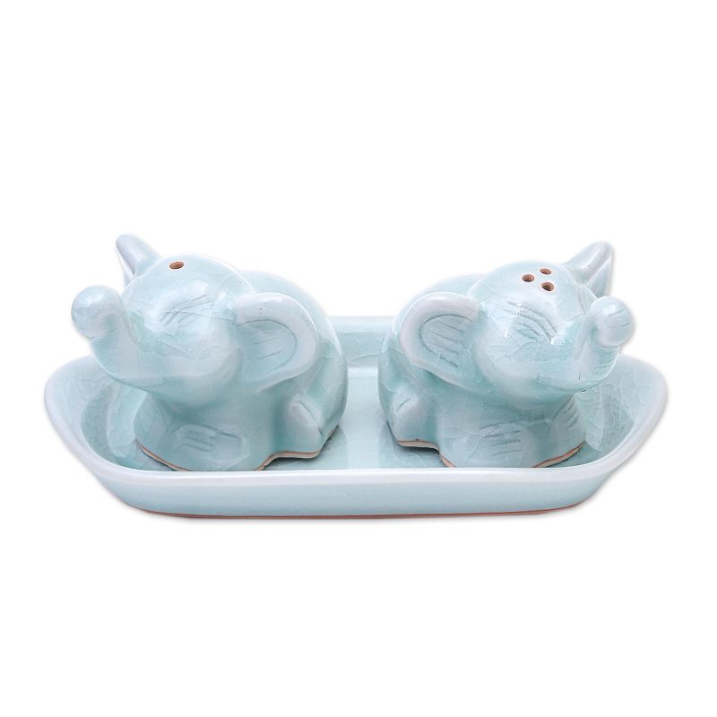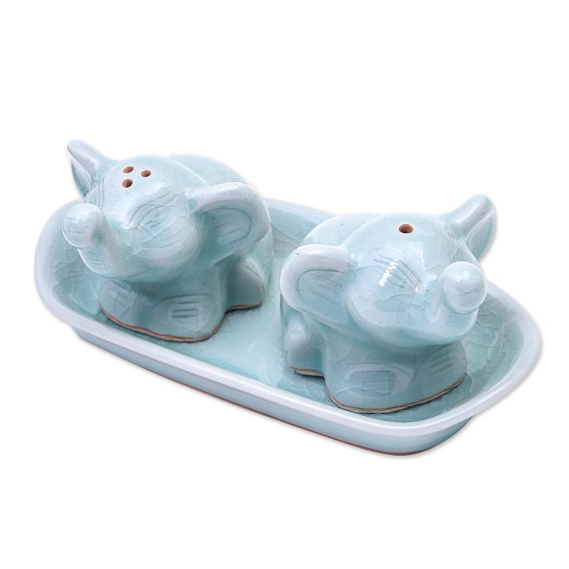 You can find our celadon ceramic salt and pepper set 'Cheeky Elephants in Aqua' (3 pieces) by Penpan in tableware categories such as Animal Themed Serveware, Celadon Serveware, Ceramic Serveware and Salt and Pepper Sets Serveware. Enjoy exploring these sections for other Novica treasures.