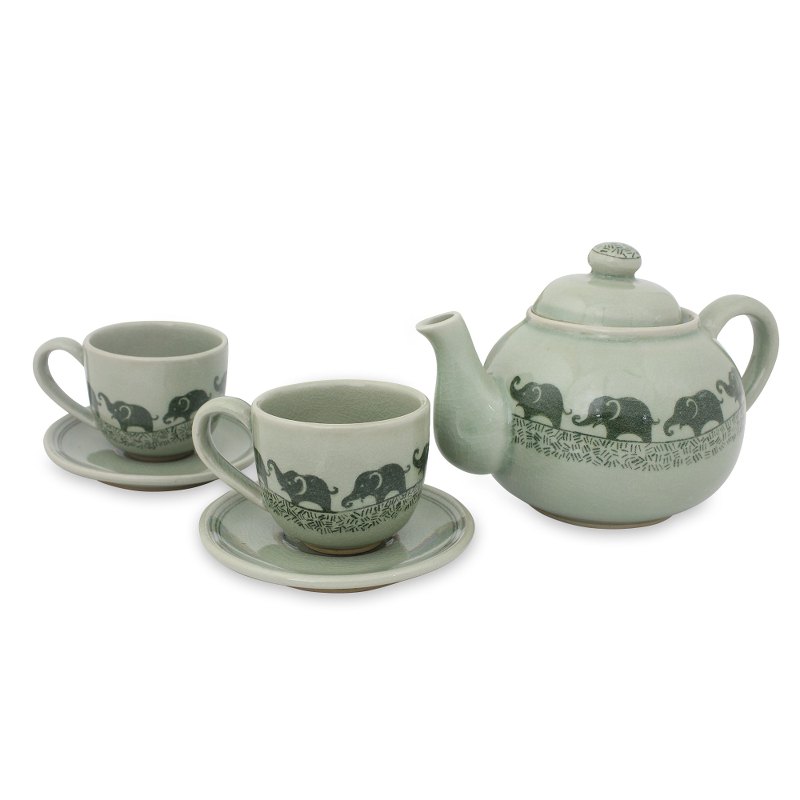 The talented Thatsanee and Ramphan in Thailand present this pretty tea set, just right for two. Dark green elephants parade around both the teapot and the 2 cups, which are handcrafted of celadon ceramic with a light green crackle glaze. The coordinating saucers feature a simple border in dark green.